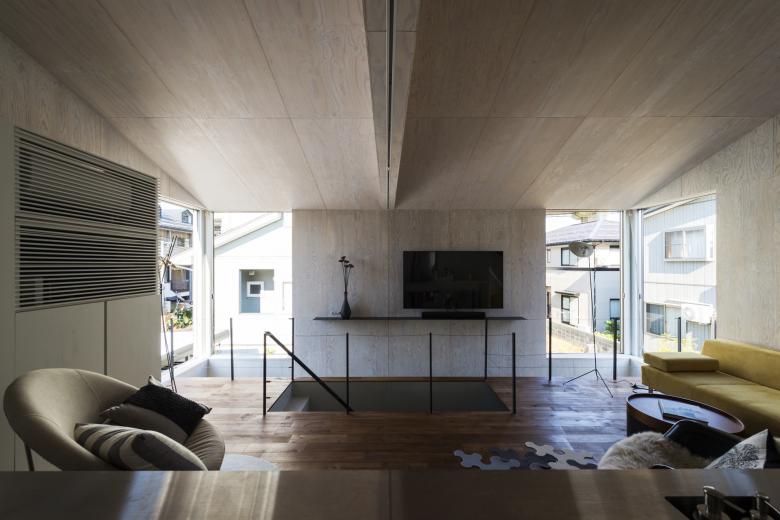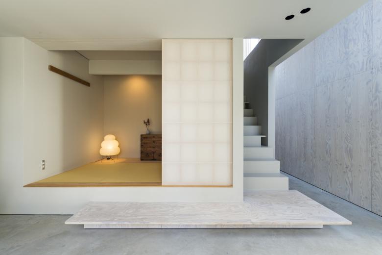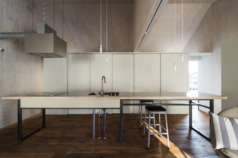 壁から天井まで張り上げられたカラマツ合板は丁寧に磨かれ白く染色されることで光を適度に拡散してくれる仕上げ材となり、ここでの日常を包み込んでいる。