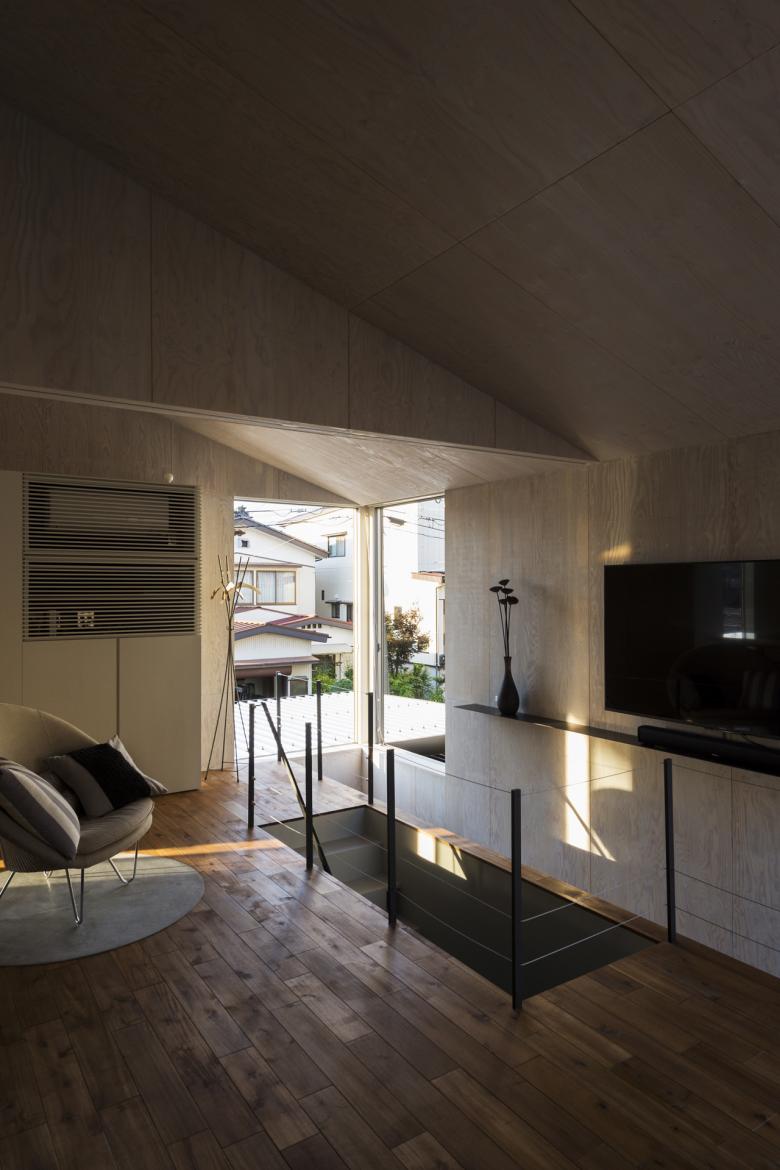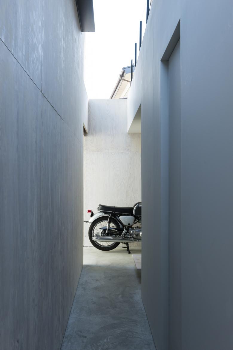 その材料の曖昧さと、サッシレスと見えるべく突き詰められた開口部のディテールがこの住宅の「屋外のような、室内のような」といった曖昧な空気を生み、1Fは庭の傍らにある東屋のようで、2Fは工場地帯に出来た気持ちの良い小振りな空中公園のような。