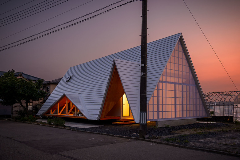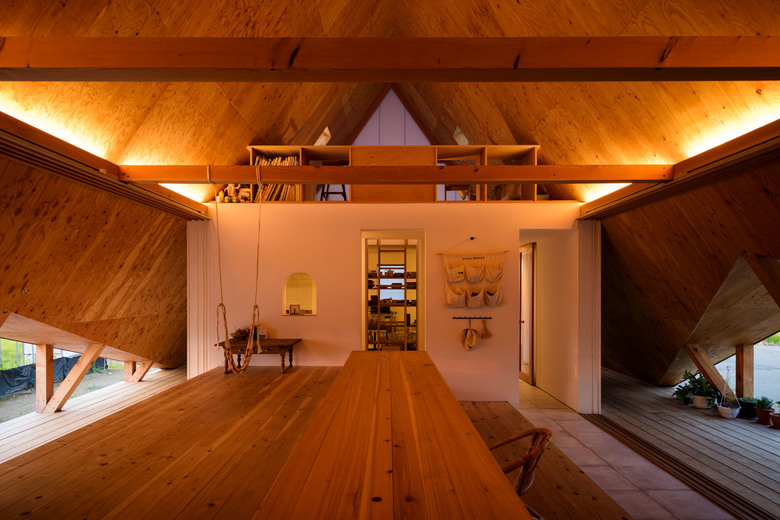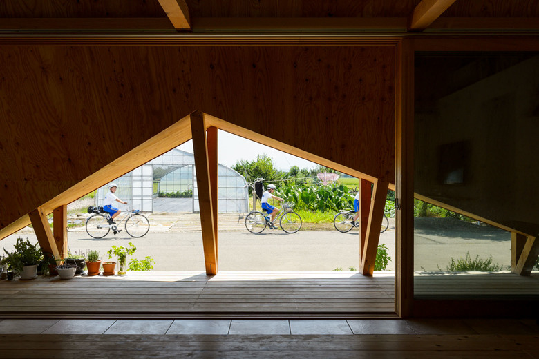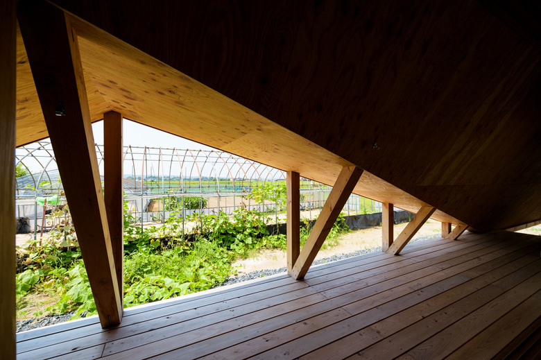 周辺にたくさんあるビニルハウスや農舎の架構を踏襲し、全ての材に小さな120mm角材を利用したシンプルなトラスの反復構造とし、弱い材の組み合わせや連続による、強く大きなそして軽くおおらかなテントのような空間を実現。