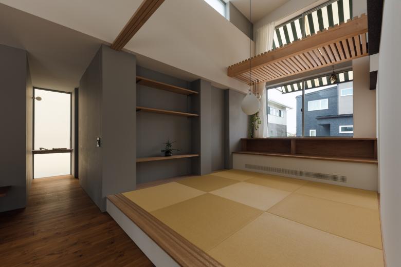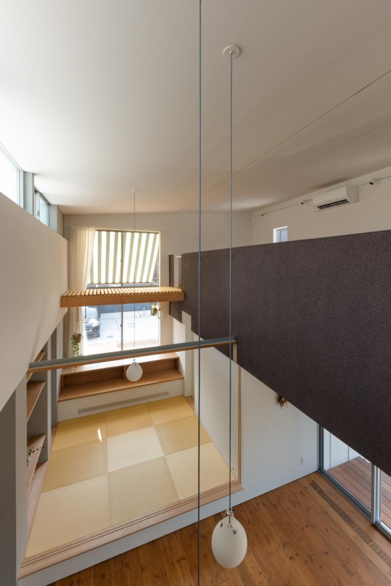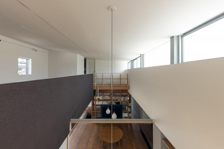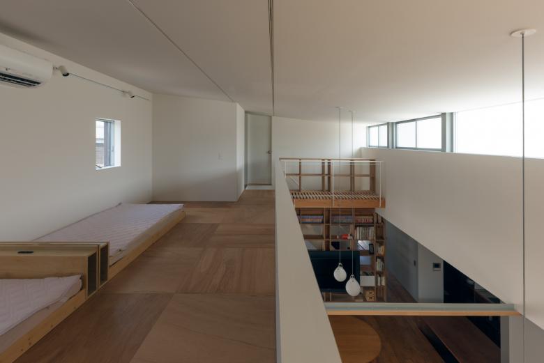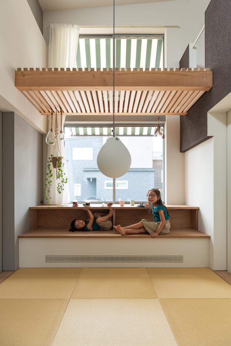 大きな窓の内側にはベンチや勉強机、またはお雛様を飾るステージとなるような造作家具を設え子供達の拠り所とし、2階レベルでは窓辺に木製スノコを架け日向ぼっこの場所とした。