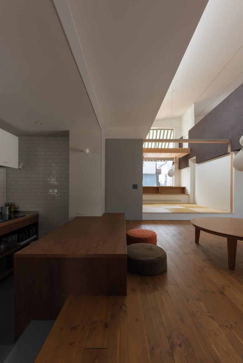 外側には室内の延長として天井高さが低く抑えられたスキップデッキテラスを設えた。
