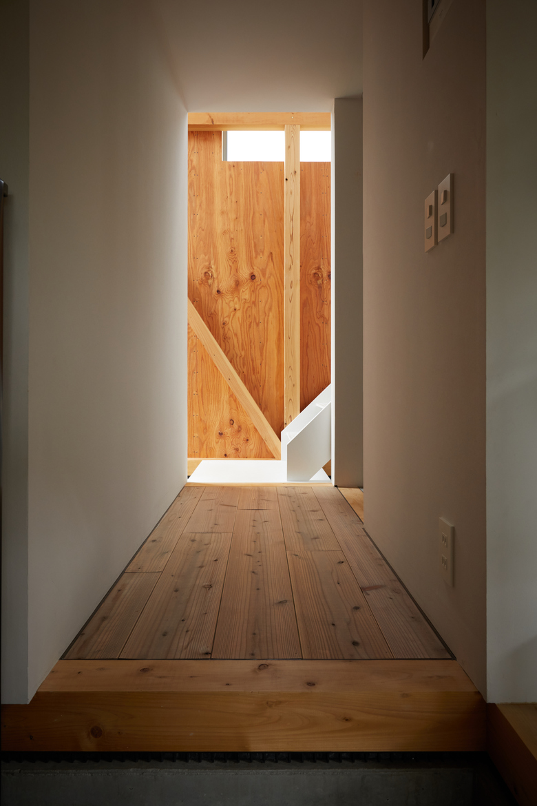 外皮の軸組を全て表しとし、軸組の外側に断熱及び外壁を仕上げています。実際の壁厚は160mm程と一般的な壁厚としながらも、それを基礎及び軸組の外側に追いやることで、その実際の壁厚をどこか意識の外に追いやることを試行。日常の暮らしの床レベルを地面レベルまでに下げて、暮らしの直ぐ傍に基礎が見え、そして軸組が見え、ベニアが見えるといった簡単な建築操作は、サッシのディテールや小さな構造部材(構造材は105角 90角 105*150)を利用しての大空間、見せない仕口金物ディテールといった繊細なデザインや細やかな配慮と重なり、