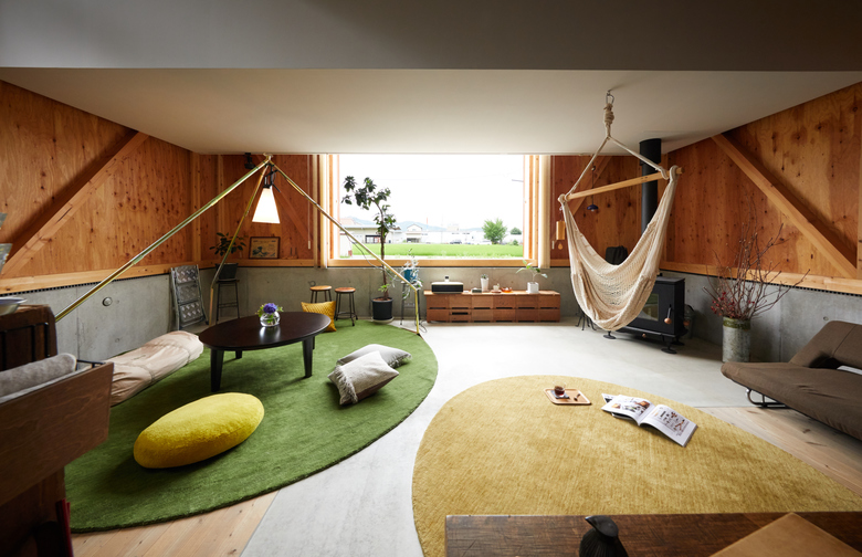 基礎の通常より少し高めに立ち上げ、その中にそのまま生活空間を入れ込む。RC基礎の立ち上がりはしっかりと外断熱をされ、薪ストーブの放射熱を大量に蓄え、輻射熱を発生させる。また、どうしても外皮性能を断熱材の厚さに頼らざるをえないこの地域において、高床とせずに生活を周辺の地面レベルとすることで、積雪そのものをもう一枚の断熱材として、もう一枚の暴風壁として活用することを試行。また夏にはこの基礎の中はプールのような冷涼な空気の溜まり場として、気持ちの良い拠り所となるように計画している。