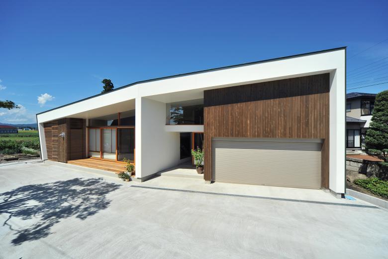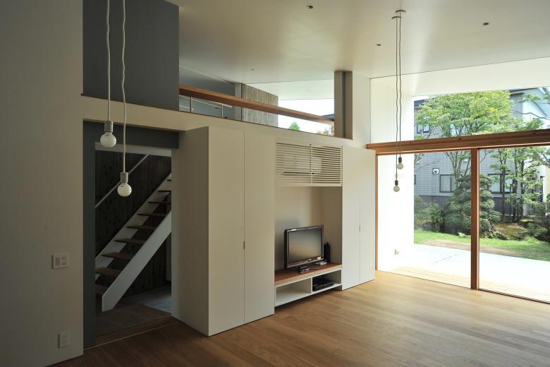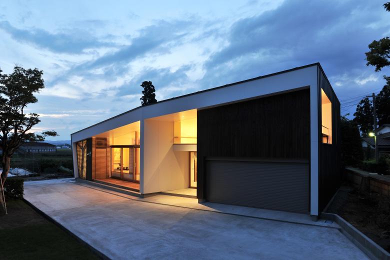 2m耐雪構造としながら建物南面を全面開口とし、南庭に面して開放性が求められるガレージ、エントランス、リビング、倉庫を並べて配置することを可能にしている。