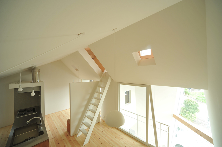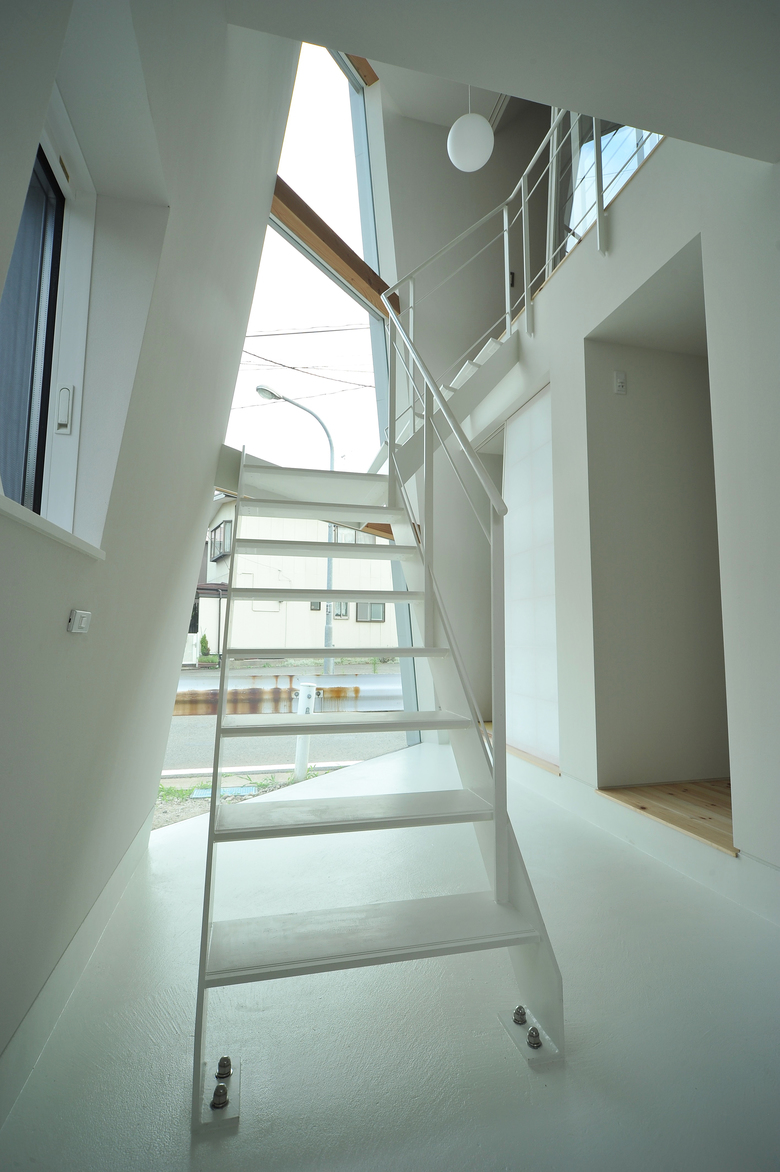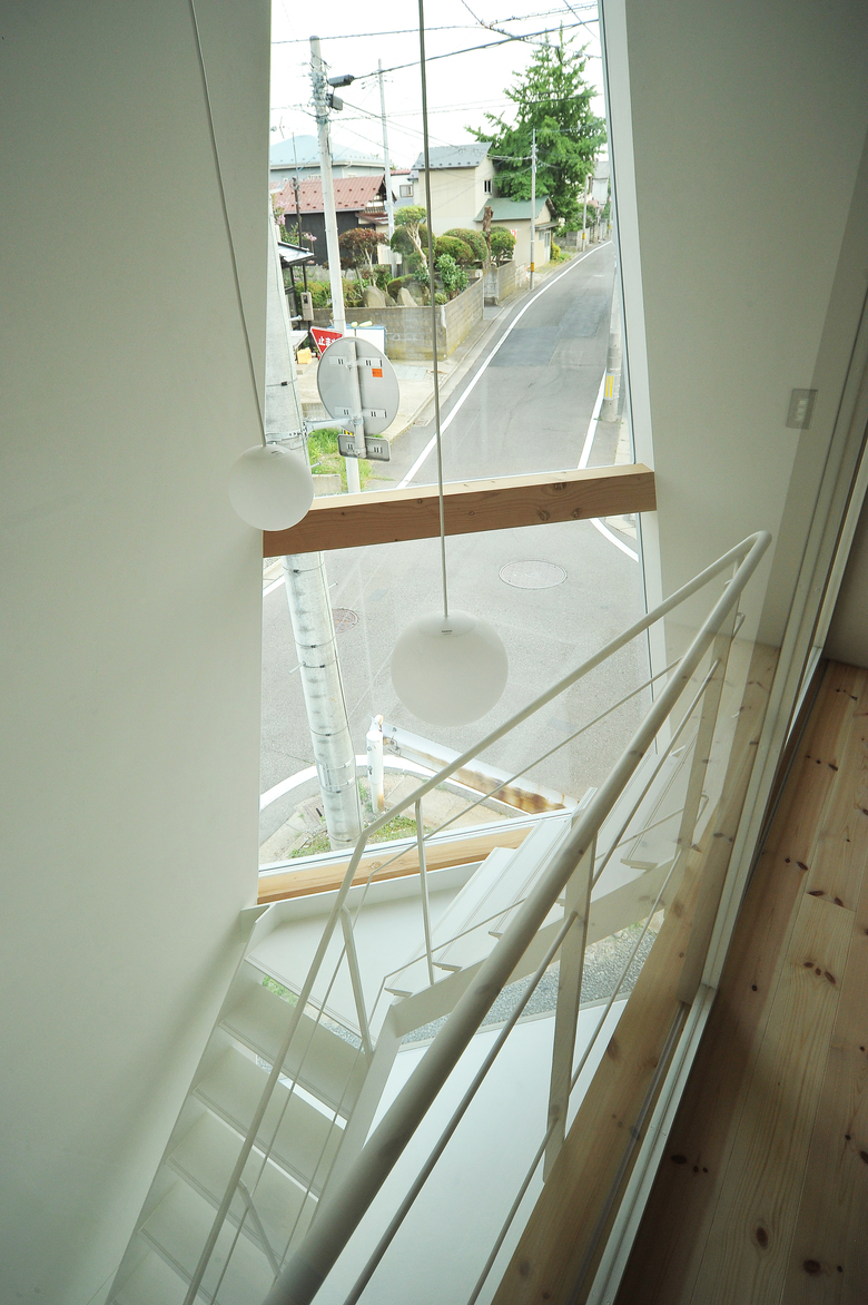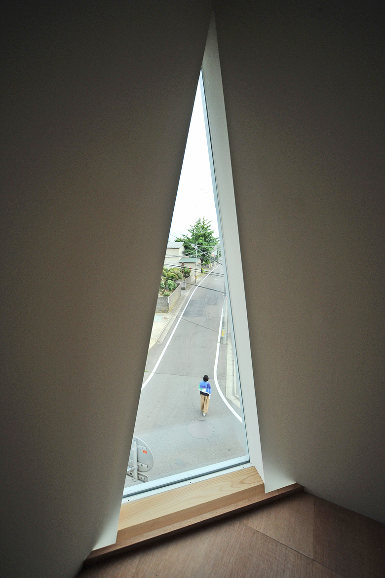 家の中が道路の延長であるかのような車の近さや、桜や草木の栄枯を日常の上下階の移動の中で垣間みるように、変則的な折れ階段と三角窓が、街並みや季節を取り込むきっかけとなり、生活をより色彩豊かに広がりのあるものにしてくれている。