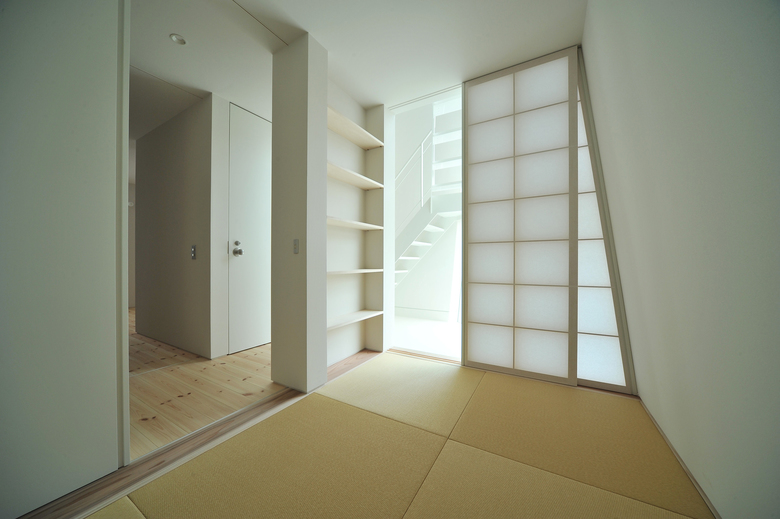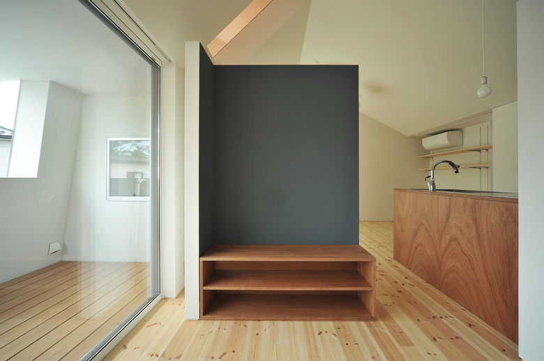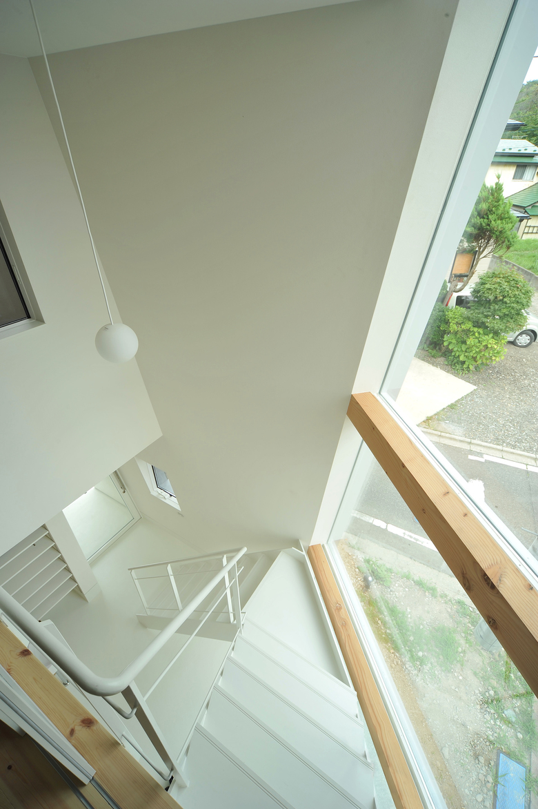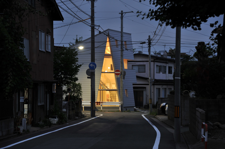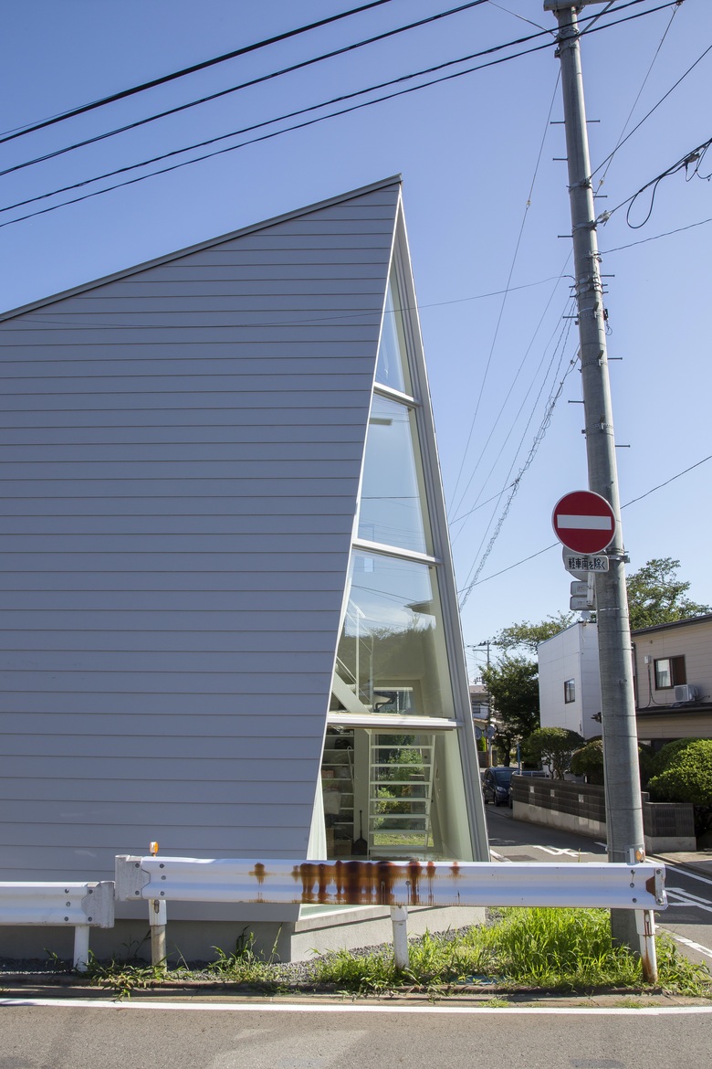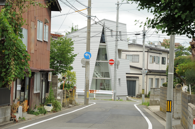 家の中が道路の延長であるかのような車の近さや、桜や草木の栄枯を日常の上下階の移動の中で垣間みるように、変則的な折れ階段と三角窓が、街並みや季節を取り込むきっかけとなり、生活をより色彩豊かに広がりのあるものにしてくれている。