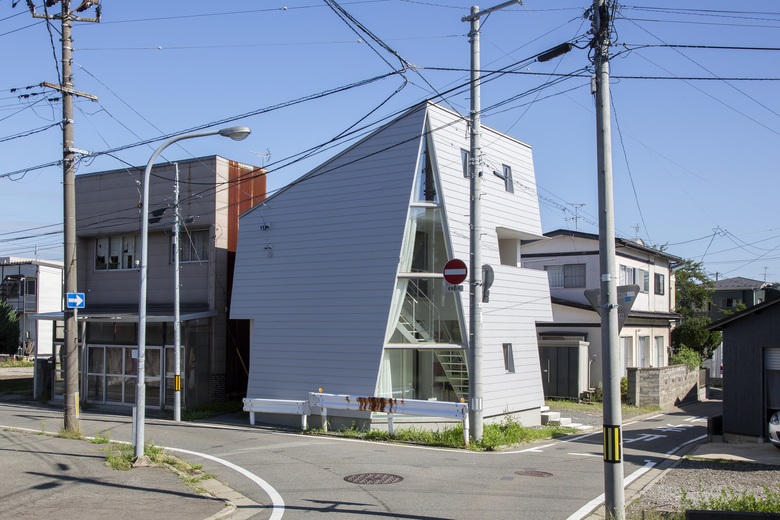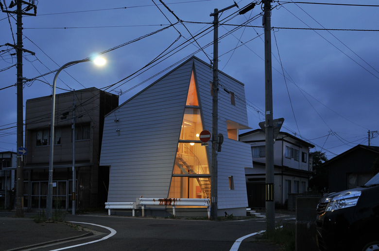 敷地は秋田市楢山、太平川沿いに1000本にも及ぶ桜が連なる桜並木からほど近い、高密度に建つ住宅地。 三叉路の角地にあたる28坪の小さな土地に夫婦と子供の3人が暮らす住宅を計画。