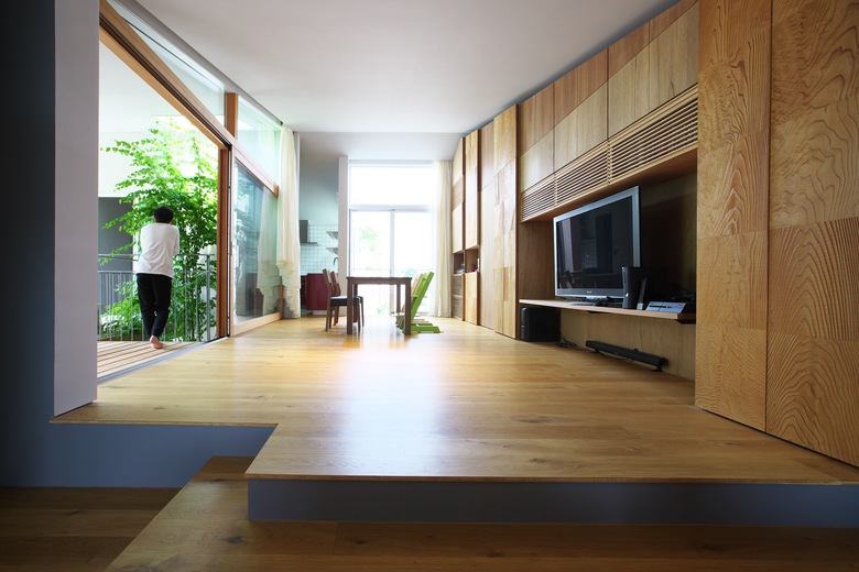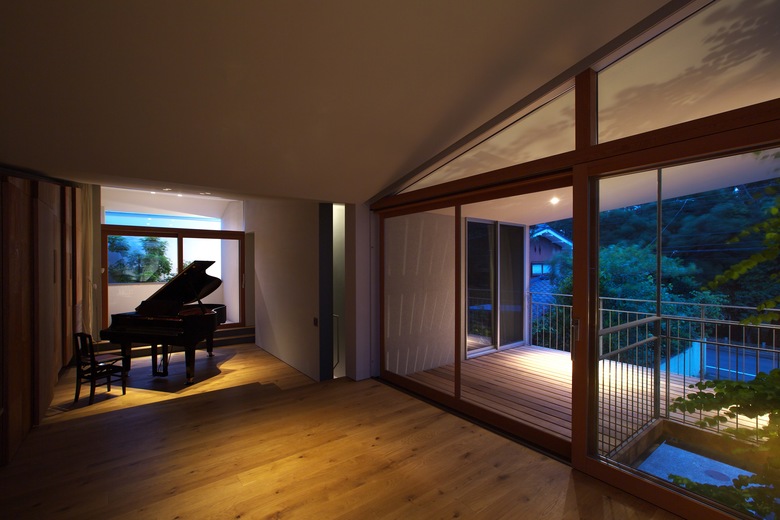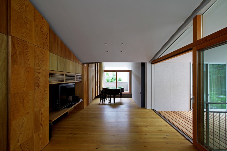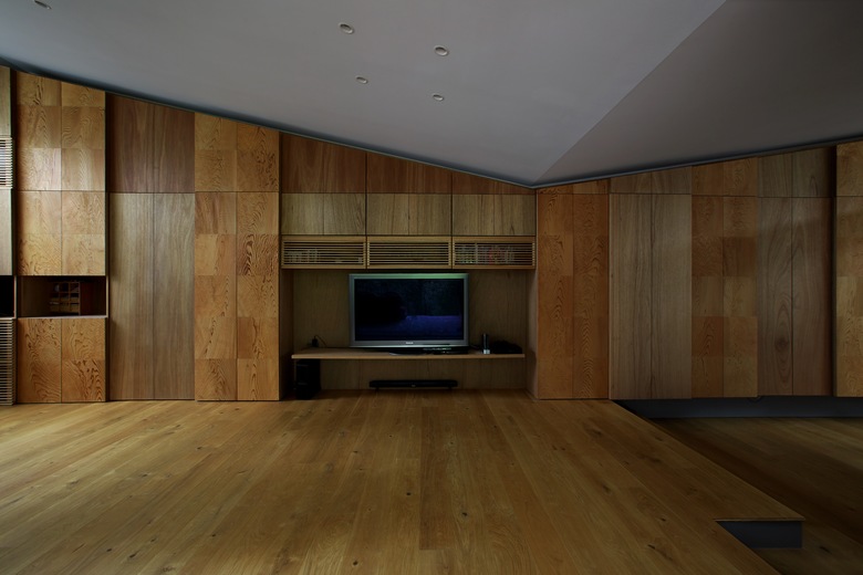 LDK南側には開口を設けず、クライアント生家にて大切に残されていた格天井材を再利用した壁面収納を配置し厚い壁とした。それにより、敷地南側に近接し立ち並ぶ4軒の家に対しての、ピアノの防音を計画。厚さや材種の異なる収納壁は防音という性能を超えて、豊かな音色を作る音響壁としての性能を発揮出来ている。