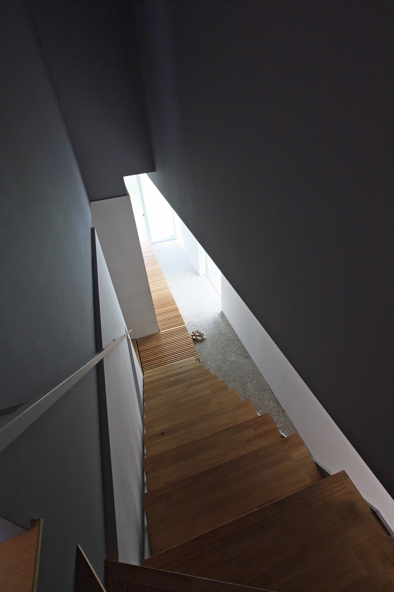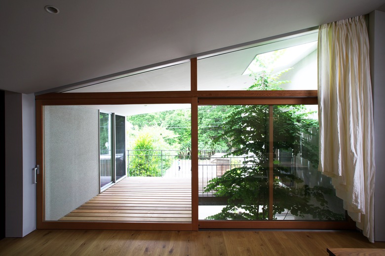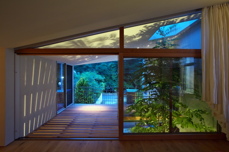 また、この土地において開放的な家族の拠り所を作るために、2階に配置されたLDKの外部には2Fまで届く背の高い樹木を沢山植え、その樹々に面してリビングの東西そして北面の3方に大きな窓を開けた。東西2面の大開口については、植えた樹々を包むように更にその外側に壁を回し、それにより作られる「屋外のような室内のような曖昧な領域/バッファスペース」が、雪や雨、夏の日射や冬の北西風、そしてプライバシーを調節し家を守ることで、高密な住宅地の中で、四季の変化に包まれた豊かな生活が獲得出来ている。また、その壁を防火壁とすることで、準防火地域であるこの敷地において木製サッシによる大開口を実現できている。