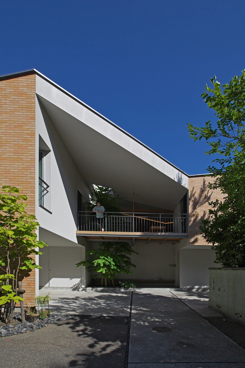 主寝室、和室といった個室をコンパクトに1Fに配置し、それ以外を全て2Fに配置することで、地面に接する建築面積を出来うる限り小さくし、敷地に大きな余白を残した。建物は1Fより2F、2Fより屋根を大きくすることで、その余白には大きく屋根が架けられ、有用な屋外空間として子供達の遊びや家族の色々な活動を支えてくれている。