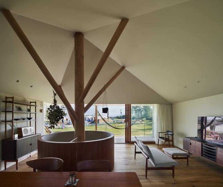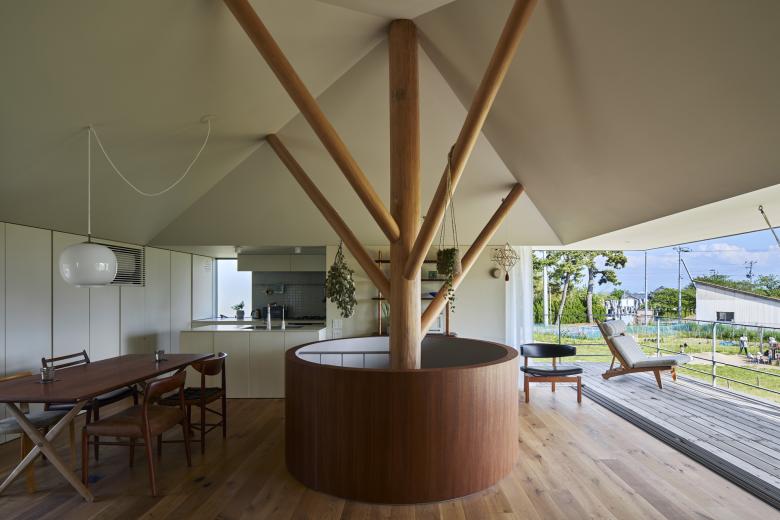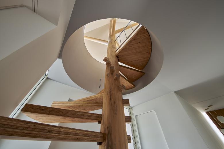 上下階を貫通するように近隣で育った直径360mmの杉丸太を建て、それを手がかりに階段や屋根を架けている。