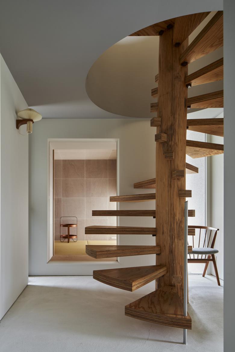 金物を用いず、木と木の差し込みのみで構成された階段は凛とし強いインテリアとなり、