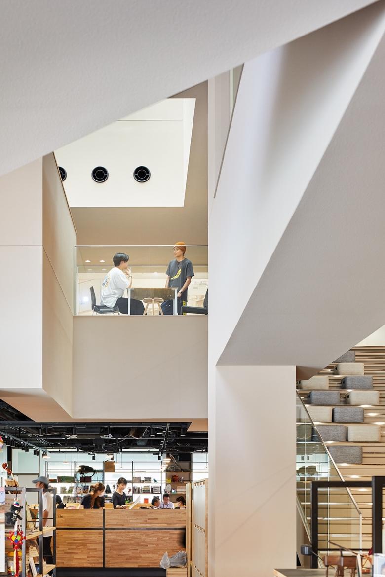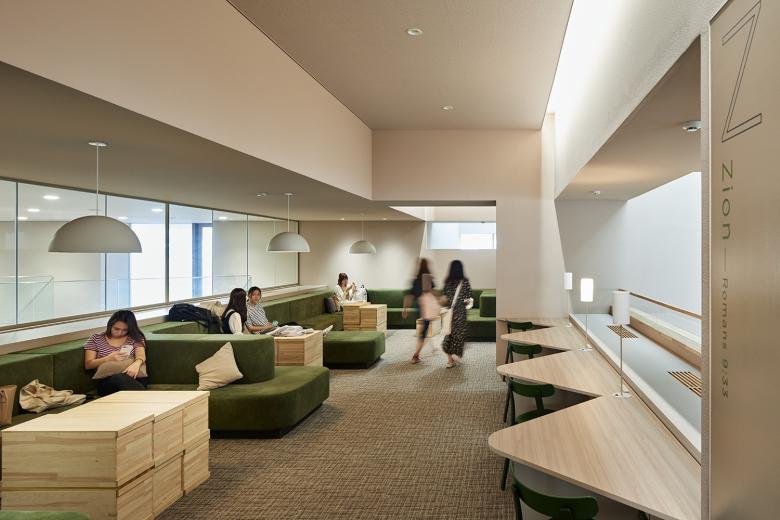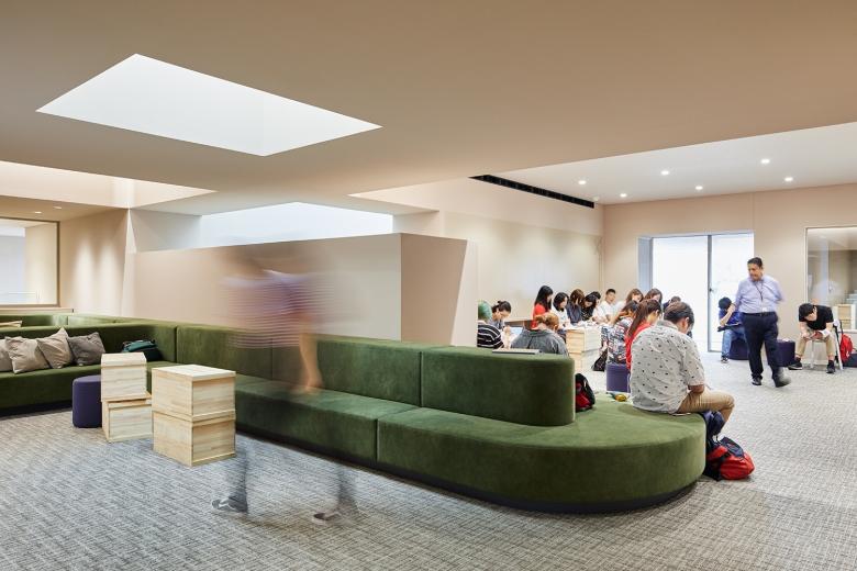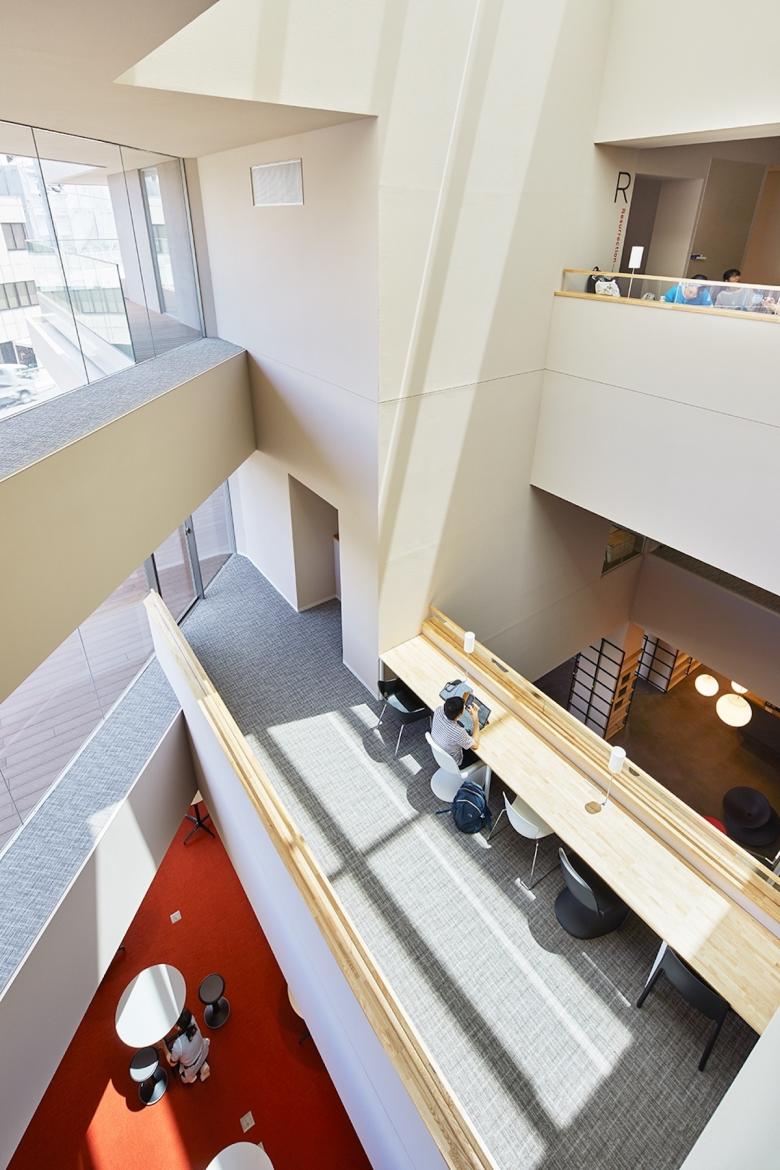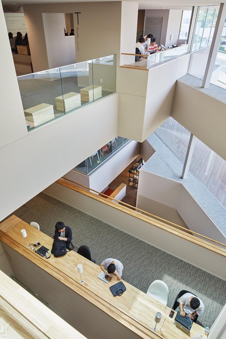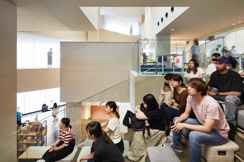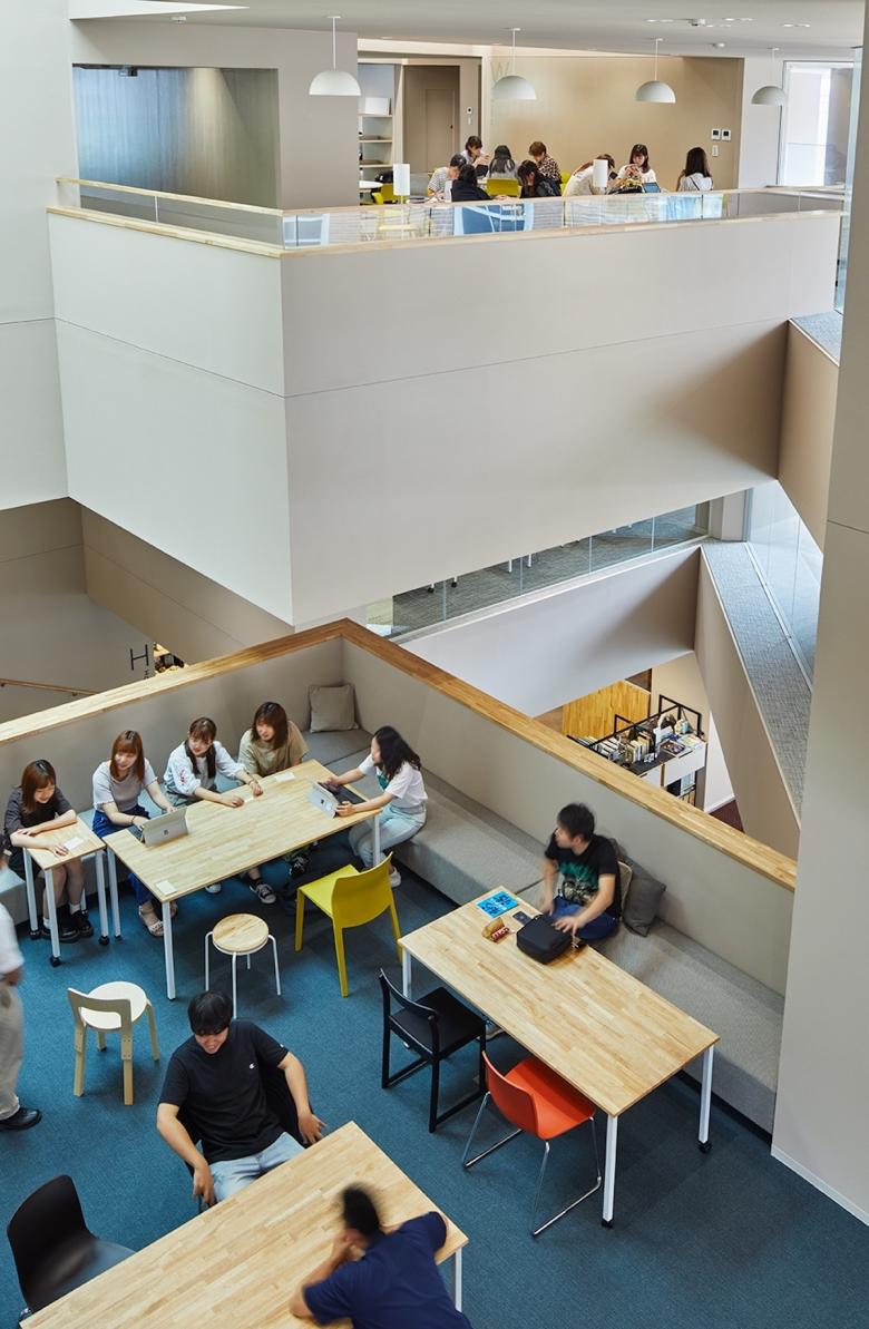梅光学院大学新校舎「The Learning Station CROSSLIGHT」は、学生が世界で活躍できる人材となるべく、”考える力”“生きる力”が培われる場を目指している。山口県下関市のキャンパスは、襞状の複雑な地形に道路が入り組む、密集した市街地にある。学校や市体育館、住宅などさまざまな要素が周囲を囲んでいることから、新校舎はこれらの中心的な場となるよう、キャンパスと街との境界をなくし、建物へ多方向からアクセスできる出入口を持たせた。点在した立体ヴォイドによる動線や視線が複雑につながる三次元網目構造の概念によってつくられたアクティブラーニング空間は、学びの空間そのものが都市構造(社会の縮図)と連続し、まったく新しい学びのシーンをつくり出していく。