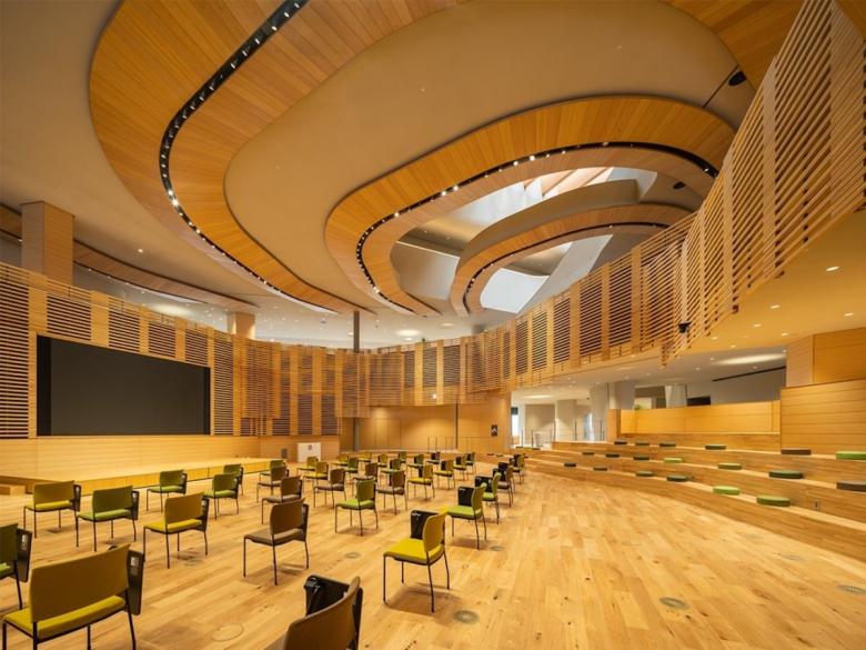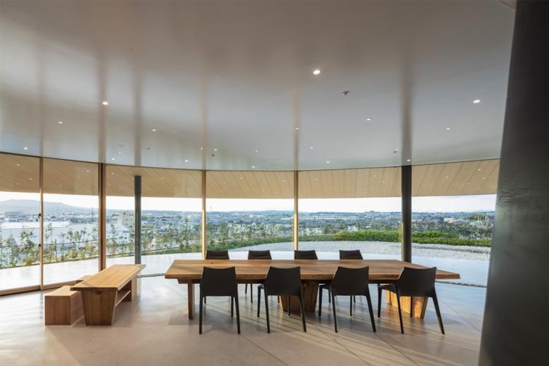 自然光が入る360度開かれた500人収容の「太陽のホール」、食を通して語らう場である「風のパティオ」、創業者精神を学び、自分自身と向き合う場「水のサロン」、その三つのエリアがメビウスの輪のように絡みあう動線でつながることで、有機的に連続し、人間の活動を制限しない空間をイメージした。
