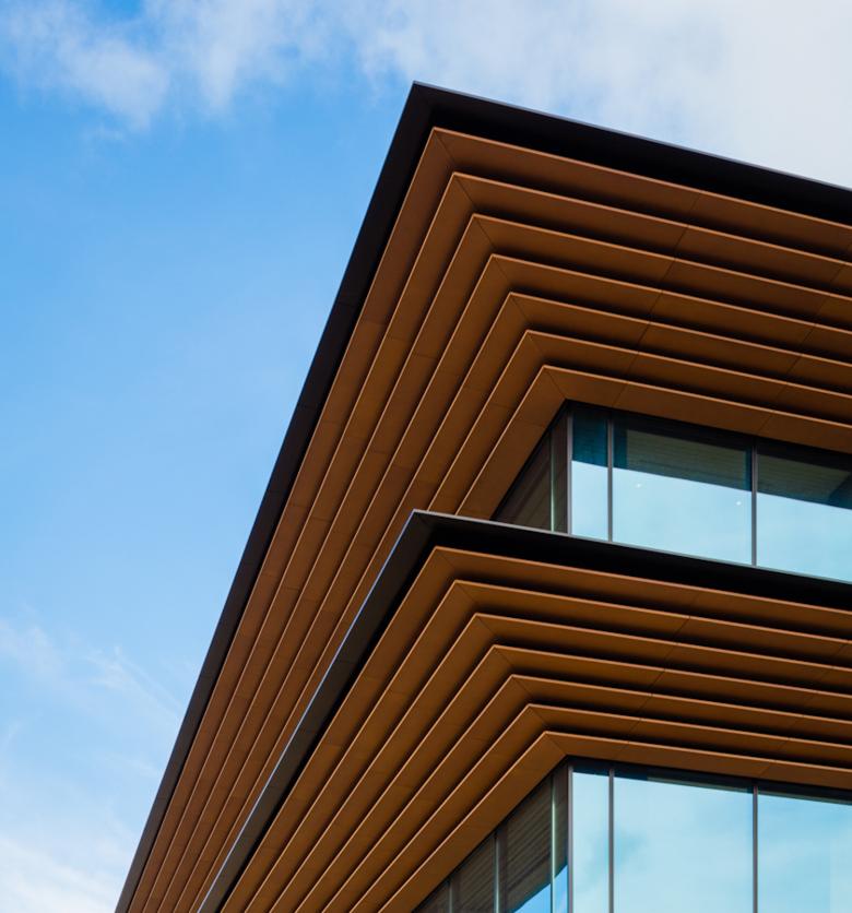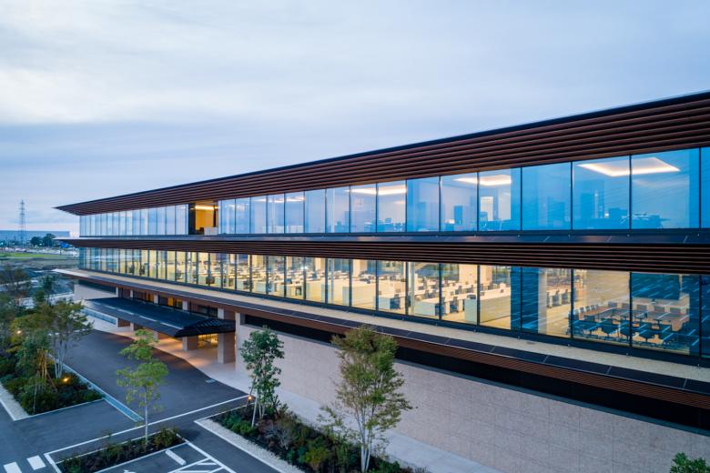 70m×48m、ワンフロア約3,300㎡の低層3階建とし、2・3階の四周は大型ガラスファサードで覆うことで、名峰白山を望み、周囲360°の景色をとり込むオフィスとした。ファサードは大庇とルーバーの重なりが水平ラインを強調し、ガラスと自然石の組み合わせによってランドマークとなるデザインとなっている。