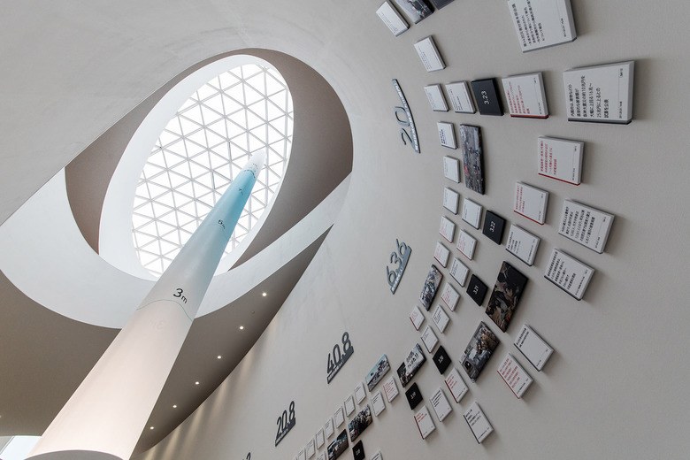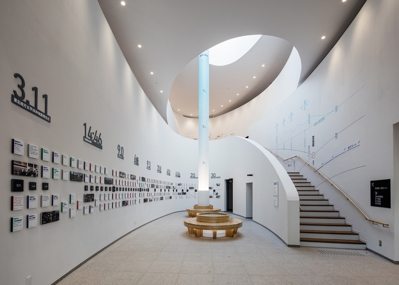 この防災教育ゾーンでは展示デザインも手掛けた。上昇性のある空間とリンクさせながら、風化させてはいけない「過去」と、「現在」、復興へ向けた「未来」をテーマに構成し、津波が到達した高さも立体的に表現した。