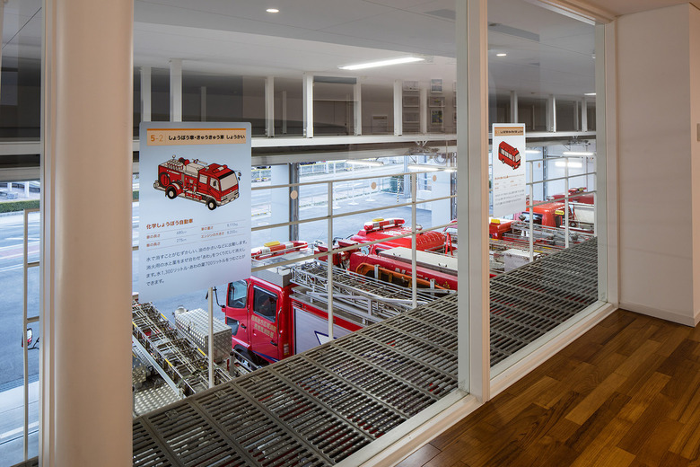 1階から3階まで連続する展示壁や手摺は高さが異なり、場所ごとにあえて視線を遮らせている。震災での防災活動記録、世界から集まったメッセージなどの展示、ガラス越しに見える消防車、或いは活動する消防隊員の様子など、壁は場所ごとに見るべきものだけを見せる空間をつくった。これは消防活動の日常的な風景と、震災による展示が交互にシークエンシャルに続いてくことで、人々に防災を強く再認識してもらうことを意図した。