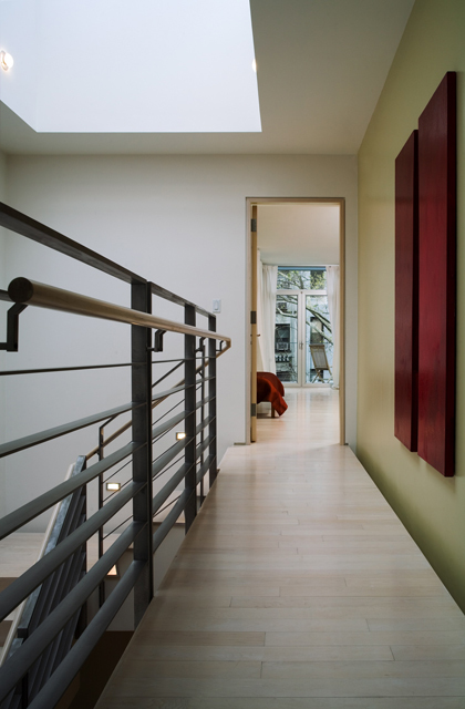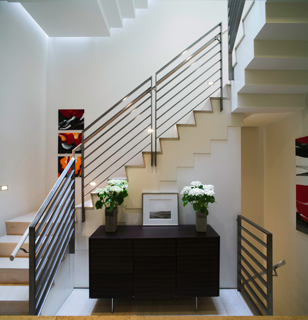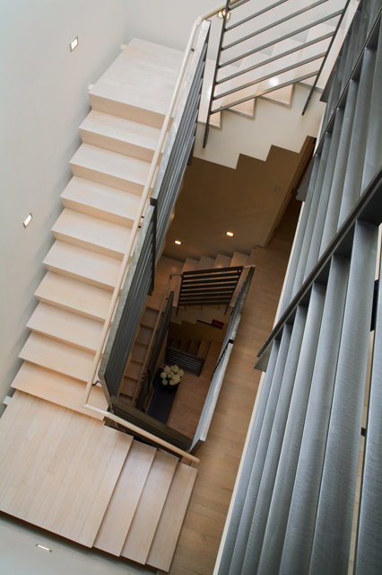 Townhouses are often defined by a narrow width with multiple floors. Stair design demands design creativity and innovation to make optimal use of space and to amplify a sense of opens. Consider waterfall or “sawtooth” oak treads and risers which cantilever over the painted stair stringer enhancing the perceived thinness of the stair section. Glass walls define the stair circulation zone at the lower two public floors, transitioning to a custom designed steel guardrail.