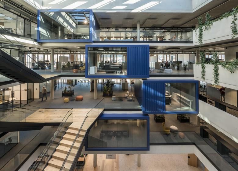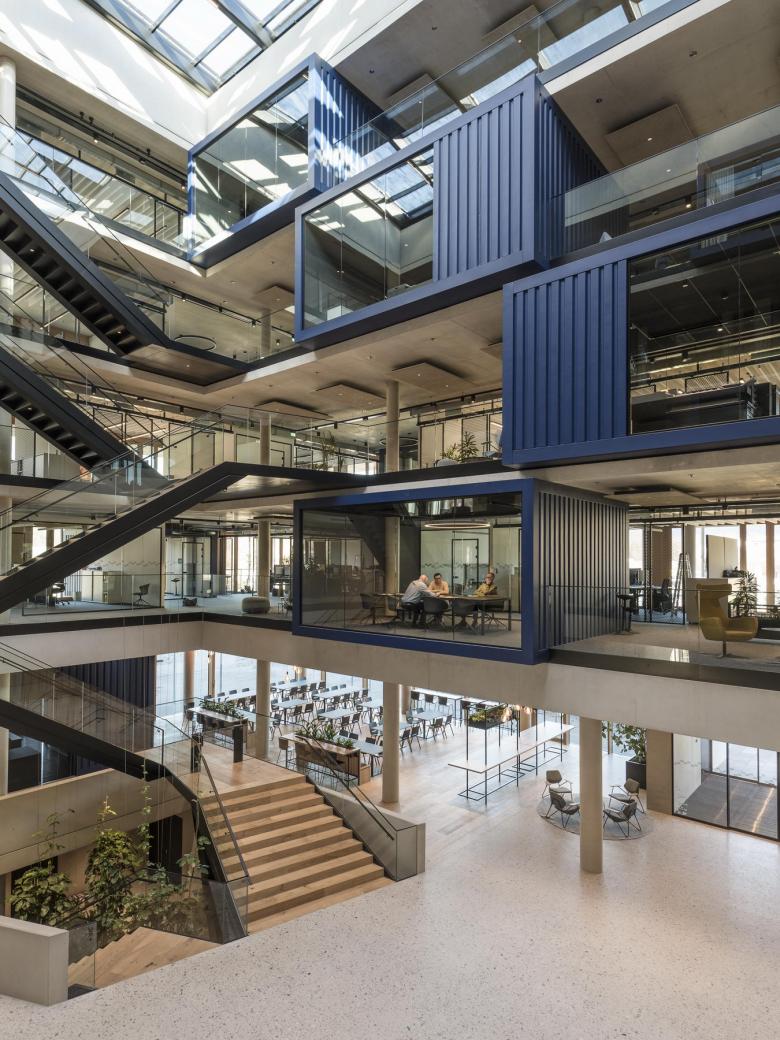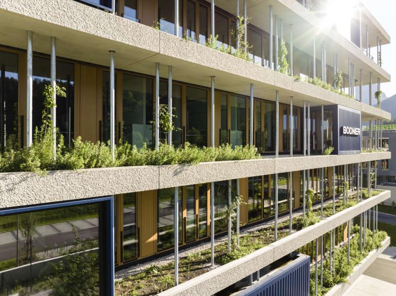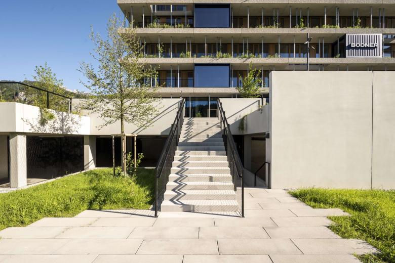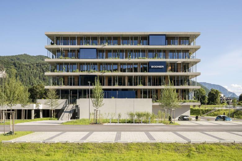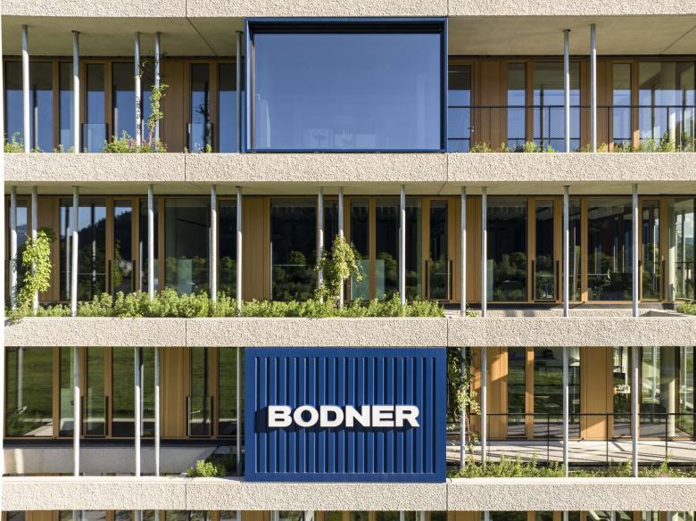 Die Zentrale ist Teil des BODNER Campus, der im Endausbau aus vier Gebäuden bestehen wird. Das architektonische Konzept des Gebäudes zeichnet sich durch massive, markante Strukturen aus. Damit wird auf die Wurzel und die Geschichte des Bauherrn und sein Kerngebiet als Bauunternehmen hingewiesen. Das äußere Erscheinungsbild zeigt Elemente von Rohbaustrukturen in Form von grob geschnittenen Deckenrändern und Assoziationen von Baustellen‐Containern im bekannten BODNER‐Blau. Durch präzise Detailausbildungen von Verglasungen, Fertigteilverkleidungen und Fensterelementen erzeugt die Baustellenthematik im neuen Kontext ein spannendes und identitätsstiftendes Erscheinungsbild. Das Gestaltungskonzept zieht sich von der Fassade in den Innenraum. Hier dienen die Container‐Boxen als Rückzugsräume und Besprechungskojen und zeigen sich in freier Anordnung im überdeckten Atrium.