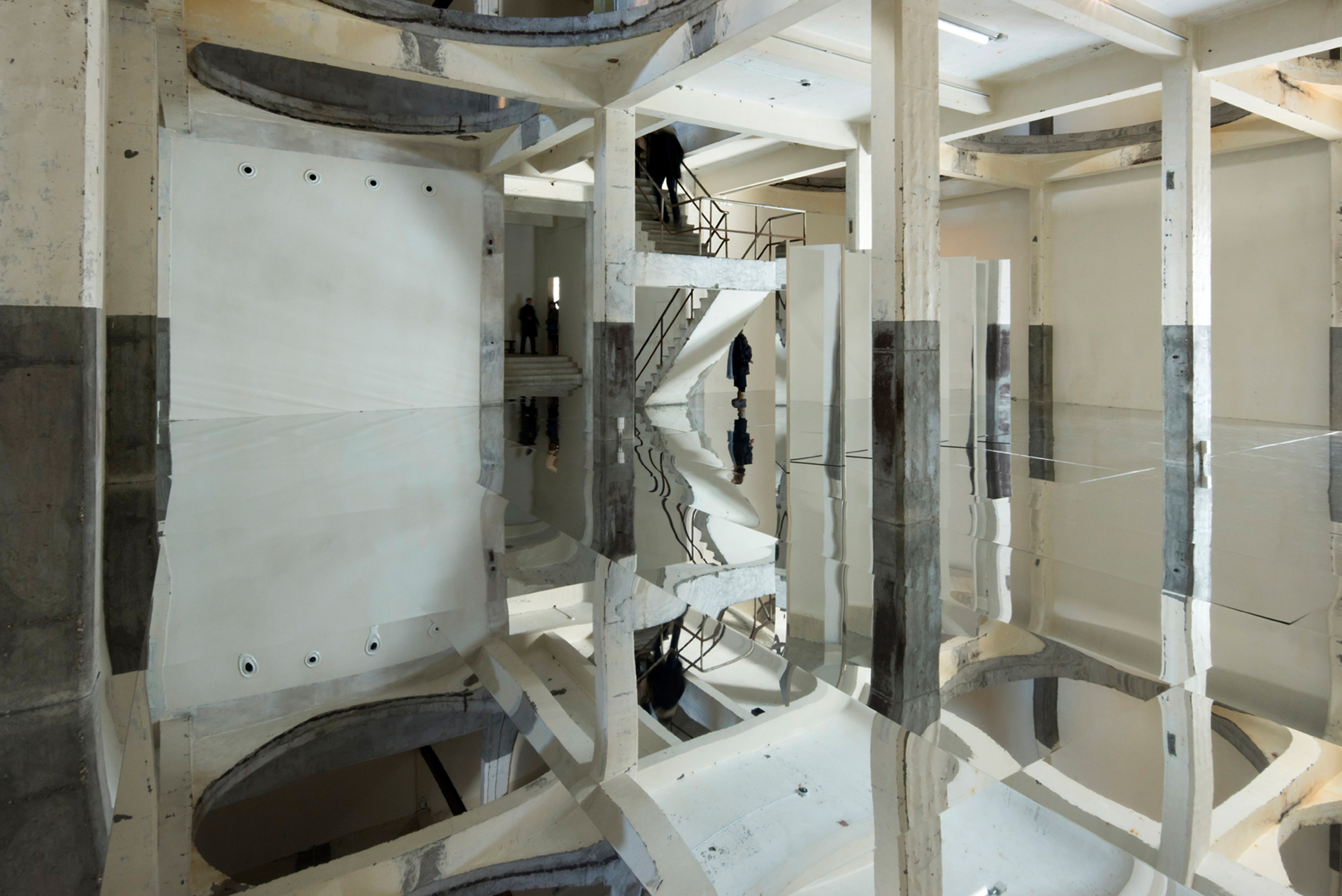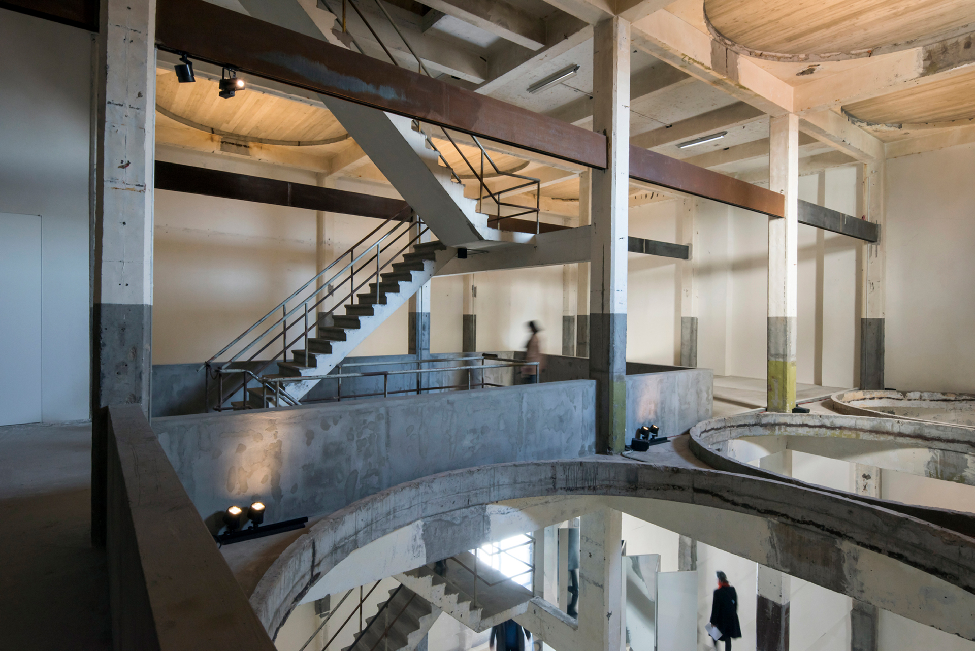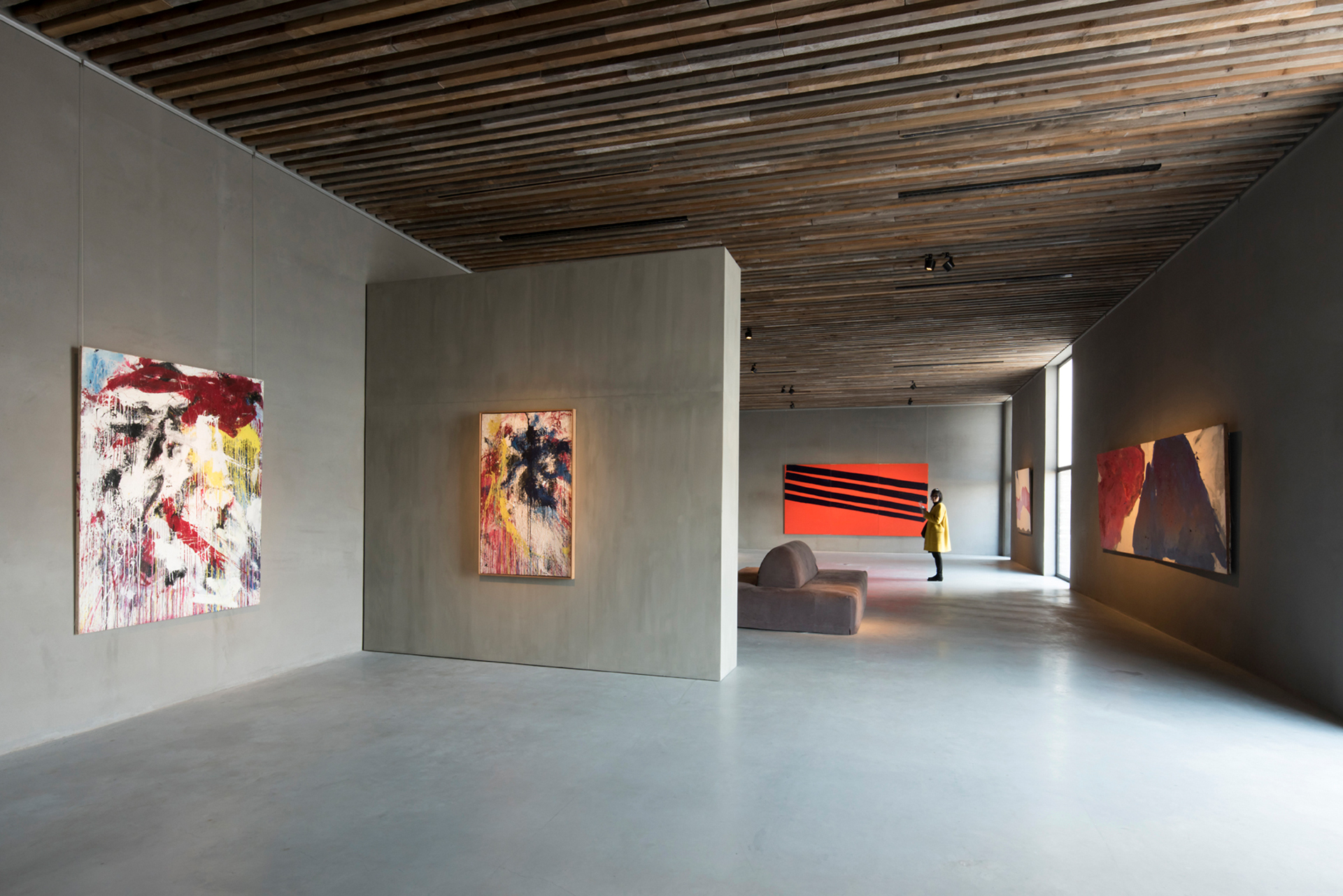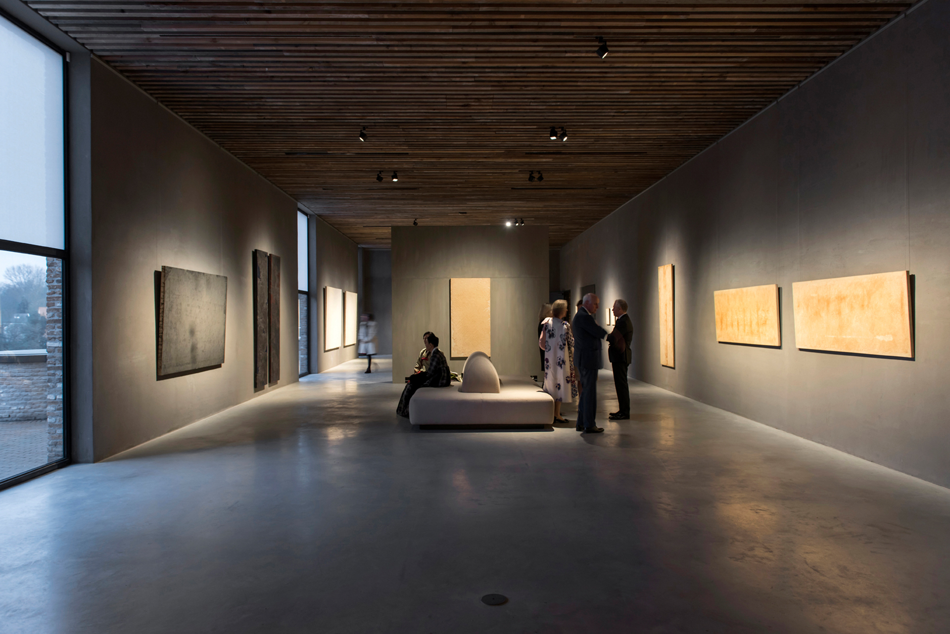 Ein Rundgang, für Besucher*innen kostenfrei, verbindet die Galerien und Ausstellungsräume des Kanaal-Areals. Die „Escher Gallery“ mit einer lichten Raumhöhe von rund zehn Metern, verschachtelten Treppenanlagen und kreisrunden Deckenausschnitten, wo einst stählerne Silos standen, beeindruckt mit außergewöhnlichen Blickbeziehungen. Von hier aus führt der Spaziergang über die Anlage an einem zentralen, mit Wasserbassins umgebenen Betonbau vorbei, der Anish Kapoors monumentales Werk „At the Edge of the World“ beherbergt. Dahinter befindet sich ein neues Gebäude, das Axel Vervoordt in enger Zusammenarbeit mit dem japanischen Architekten Tatsuro Miki entwarf. Es entstand unter Berücksichtigung mathematischer Prinzipien und Proportionen und ist in natürliches Licht getaucht. Dort präsentiert er Kunstwerke der Axel & May Vervoordt Foundation – unter anderem von namhaften Zero- und Gutai-Künstlern. Dunkelgrau getönte Wände erzeugen eine kontemplative Atmosphäre, in der die Kunstbetrachtung im Fokus steht. Die sehr gute Abblendung und Präzision der verwendeten Parscan Strahler erlauben ein spannungsvolles Zusammenspiel von Licht und Dunkelheit. Auch in den atmosphärisch völlig gegensätzlichen Galerieräumen in dem Stockwerk darüber, die mit Wechselausstellungen bespielt werden, beweisen LED-Lichtwerkzeuge von ERCO ihre Flexibilität und Effizienz: Mit einer minimalen Anzahl an Leuchten werden die Gemälde und Skulpturen eindrucksvoll und präzise beleuchtet.