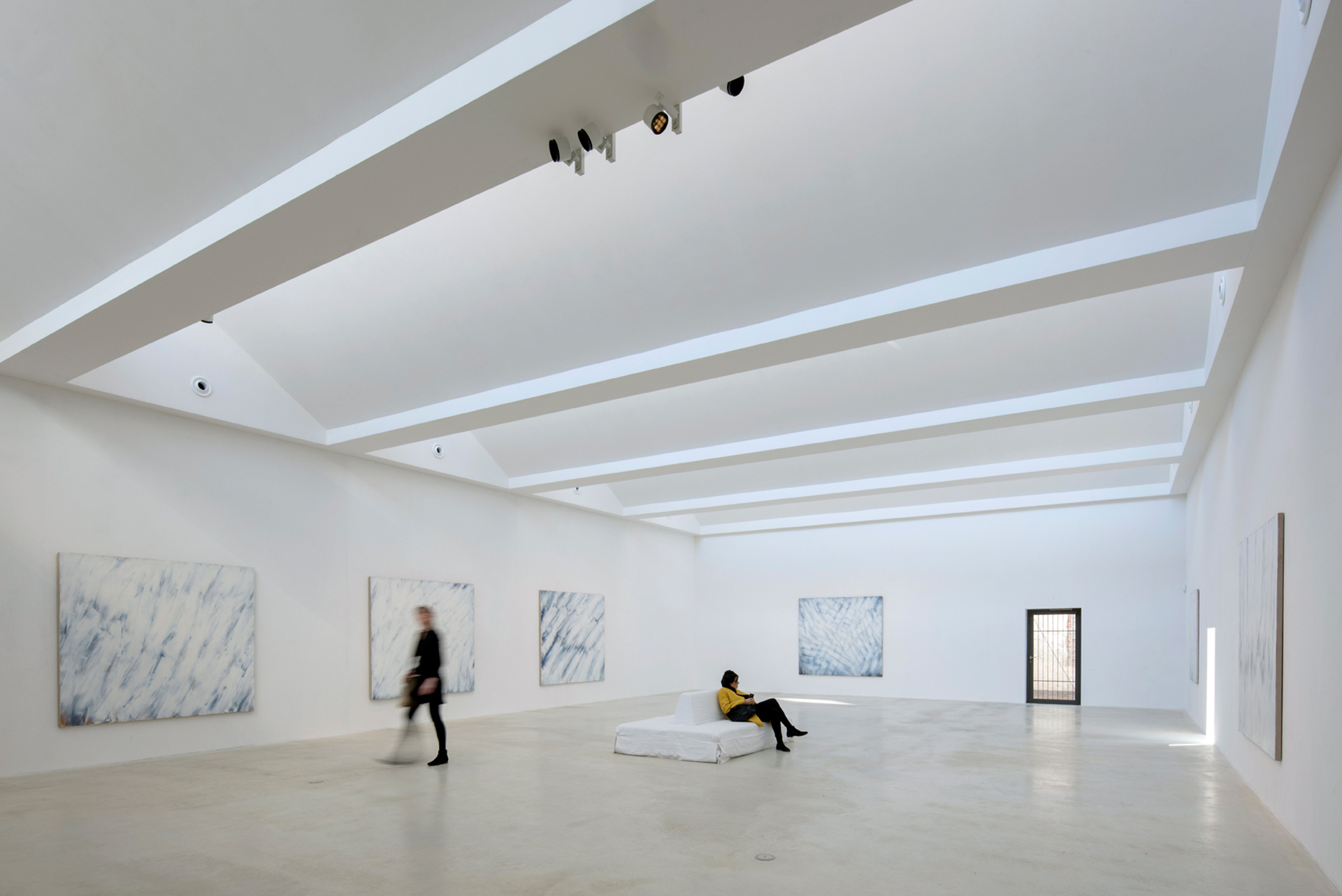 Viermal jährlich wechseln die Ausstellungen in Vervoordts Galerieräumen „Escher Gallery“, „Patio Gallery“ und „Terrace Gallery“ am Kanaal. Sie zeigen Gemälde und Zeichnungen, Fotografie und Media-Art sowie Skulpturen unterschiedlichster Formate. Manches Ausstellungskonzept erfordert die Unterteilung der Räume durch mobile Zwischenwände. Axel Vervoordts Szenograf Chris Pype adaptiert die ERCO LED-Lichtwerkzeuge dann auf die jeweils neue räumliche Situation und die unterschiedlichen Exponate. Die Spherolitlinsen der Parscan und Pollux Strahler lassen sich werkzeuglos wechseln. Die Ausstellungsmacher können Leuchten so beispielsweise von einem eng strahlenden Spot auf einen breit strahlenden Fluter umrüsten. Auch asymmetrische Lichtverteilungen wie oval flood oder wallwash sind möglich, der Lichtkegel lässt sich so optimal auf die gezeigten Kunstwerke abstimmen. Die Projektion des Lichts über Linsen ermöglicht selbst bei kleinen Wattagen leistungsstarke Akzente. Mit LED-Modulen von 6 beziehungsweise 12 Watt überzeugen Pollux wie Parscan mit kompakten Leuchtenabmessungen. Die Strahler wirken in den Räumen der umgewidmeten Industriebauten unauffällig, die Aufmerksamkeit der Betrachter*innen richtet sich einzig auf die Kunstwerke.