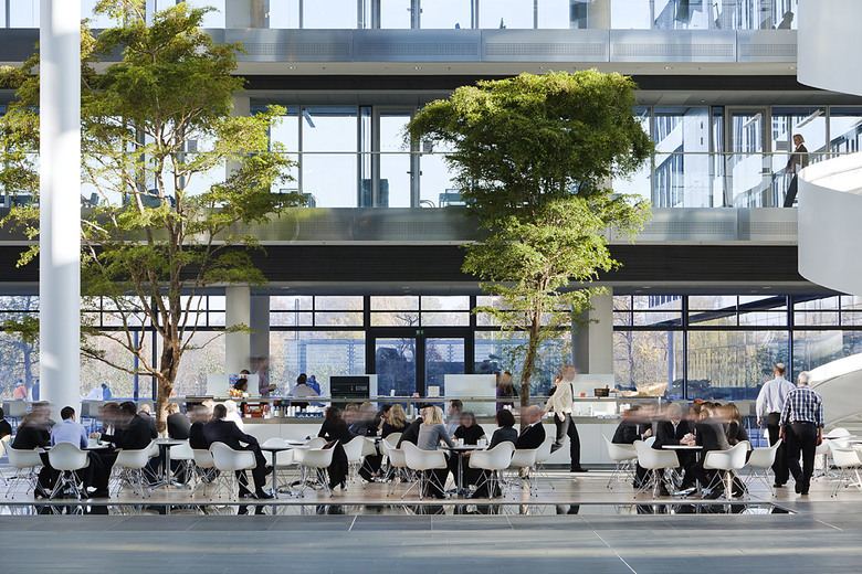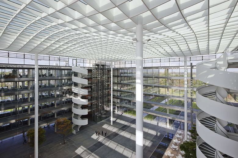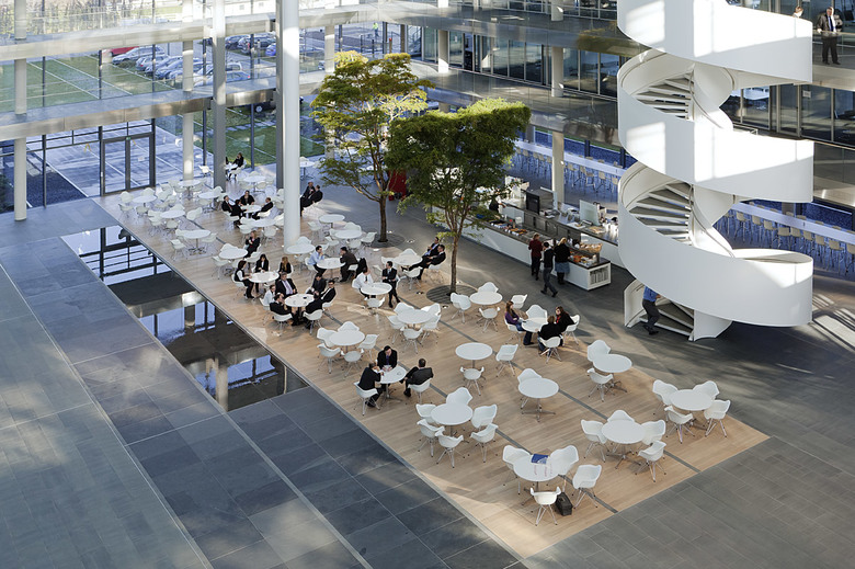 Herz des Hauses ist das 40 × 40 Meter große transparente Atrium. Von dort gelangt man mit Panoramaaufzügen zu den Arbeitsplätzen in den drei U-förmigen Bürofingern. Im Erdgeschoß liegen der Empfang, ein Konferenzzentrum und das Casino.