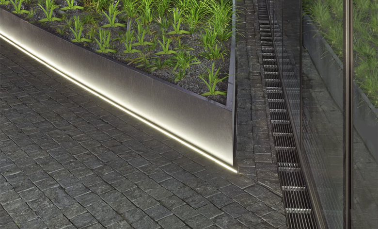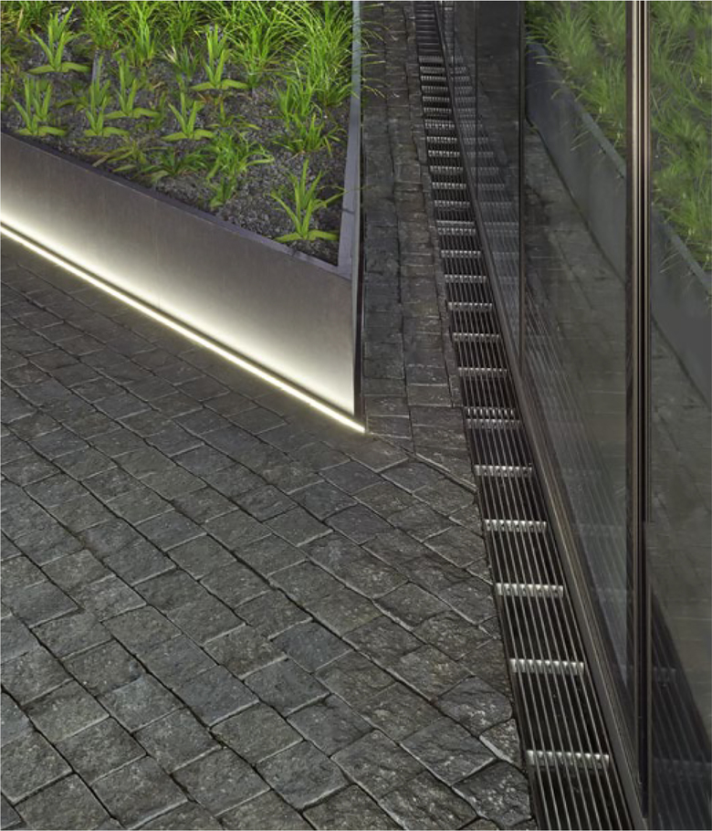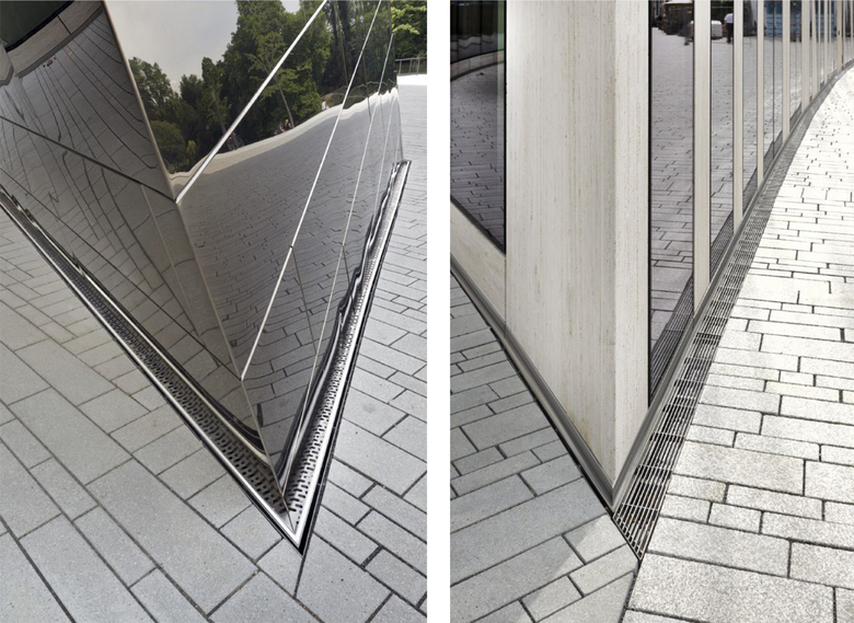 This includes unobtrusive slotted drains made from stainless steel to accentuate building outlines with their integrated illumination. Homogeneous grating design to drain the façades all around the Kö-Bogen underlines the aesthetically pleasing overall impression. In the entrance areas the bar spacing was chosen in such a way as to be kind even to stiletto heels. Furthermore, the intelligently finished surfaces of the linear gratings on the doors provide an anti-slip effect. In combination with the embedded doormats this prevents as much dust and other particles as possible from being walked in to the building.