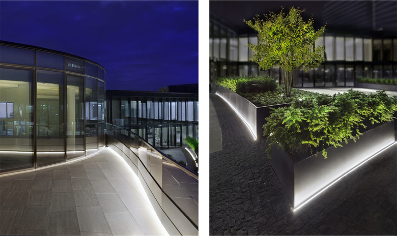 In the courtyards, which do not have illumination in the traditional sense, approximately 100 m of LED-LightLines trace the contours of the planters with a warm-white light. This results in an exceptionally harmonic bond between high tech and nature. This masterful manoeuvre is part of the overall concept: Since the bridge linking the two parts of the building is indirectly illuminated using LED-LightLines. In addition, twelve LED spotlights are used to strikingly highlight trees in planters. The result is an unusual ambience and its light mood also serves as an eye-catcher for people working in the adjacent offices.