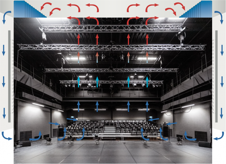 On 4,000 square metres, there are administration, storage and technical rooms on several floors, as well as rehearsal rooms and two black box stage rooms on the two upper floors, one of which is a large hall with four playable sides. This was exactely the special requirement: the walls for the GraviVent shafts must be suitable for active dance and theatre play such as jumping on.