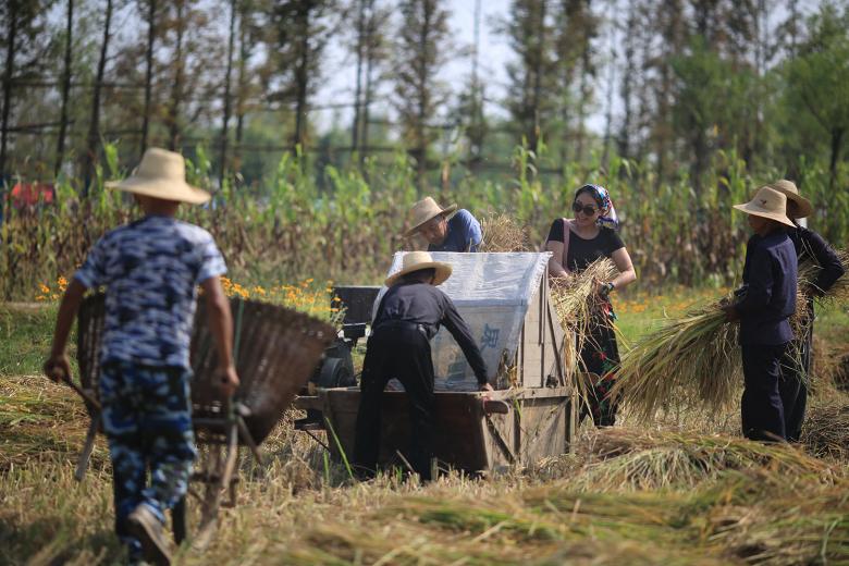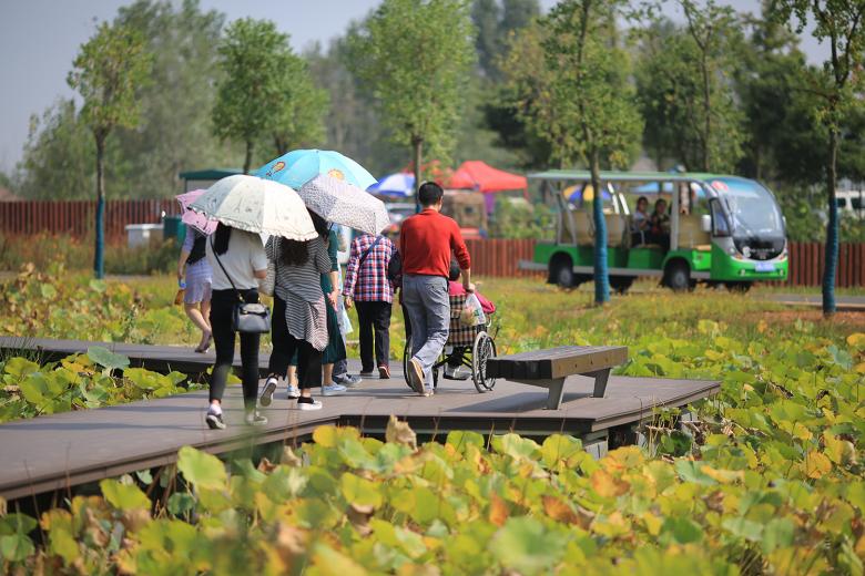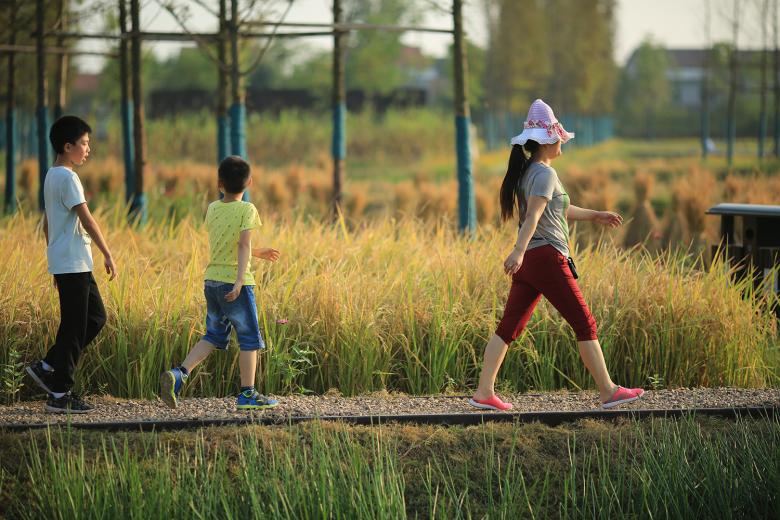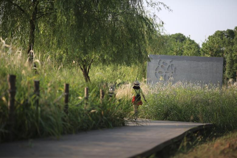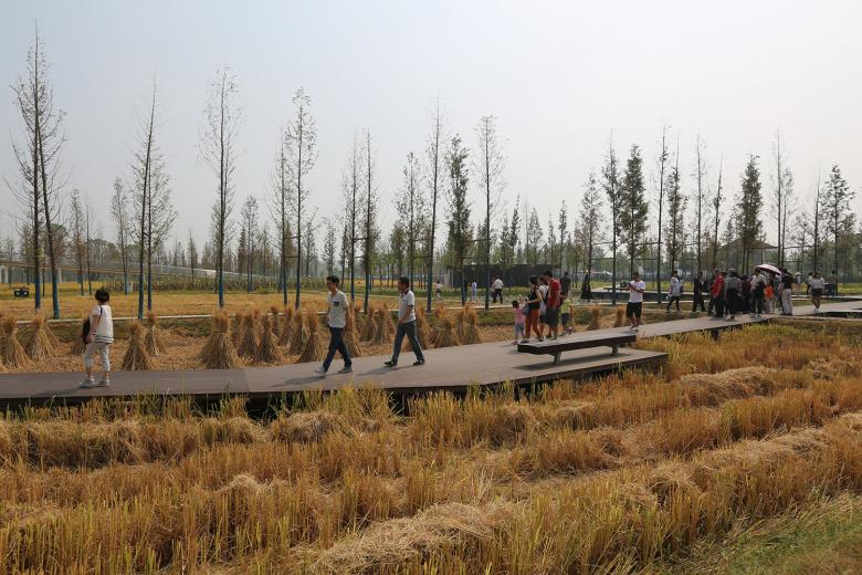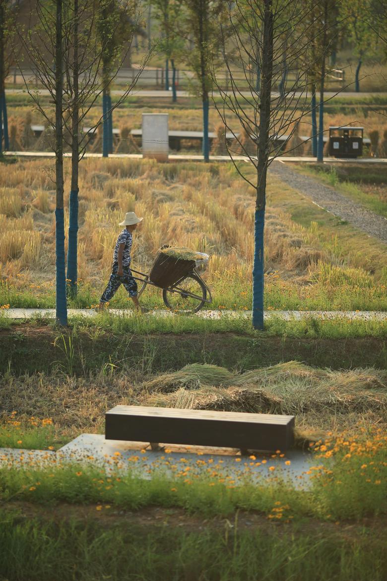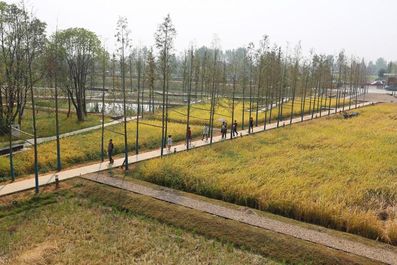 其次,用各种湿地植物及林带,对环绕古城遗址的护城河外侧水岸进行生态修复。核心区以外的公园的主体部分,被重新设计为农田,成为了一个户外的稻田博物馆。一年两季、多品种的水稻在这里轮作;作为农田景观的有机组成部分,水塘、水渠和湿地分布其中,生长着茂盛的乡土植被,这些湿地和水系像海绵一样,收集雨水,调节旱涝,同时吸收和过滤从稻田中流失的营养物质。精心设计的景观纹理将户外水稻博览区与其他一般性的农田具有相似却有不同的景观,这些田块肌理致密,田埂的朝向经过仔细的设计,形成多种微妙变换的透视角度。水杉林带只沿着大致南北方向的田埂路种植,既能给田埂路遮蔽,同时又防止树影投射在稻田里,因为这些稻田需要充足的日照来维持生长。夏日炎炎,绿荫下的道路为游客提供了舒适驻留和漫步机会。