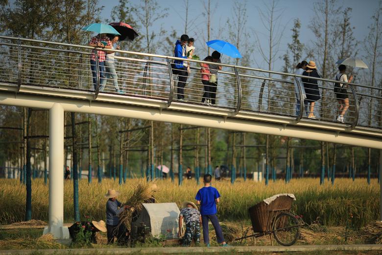 在考古遗址向一个静静的舞台,默默地激发着人们丰富想象力的同时,户外水稻博物馆的田野犹如一台活生生的,正上演着活生生的农耕生产剧:水稻种植、除草和收割都被设计成与休闲活动相互交织的生动元素,融入了诸如慢跑、野餐、散步、学校和家庭的郊游。玻璃廊桥作为观景平台和使人身临其境,让城市游客能够亲眼目睹和体验水稻种植及收割过程,并与劳作的农民进行亲密接触。参观者亦可以加入到农民劳作之中,体验其中的艰辛与快乐。在这一景观中,劳作与休闲、生产与艺术、乡村与城市、土地所有者和游客、功能和审美之间都不分彼此地融合在一起,营造出美丽和谐的一幕。