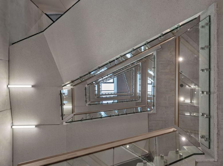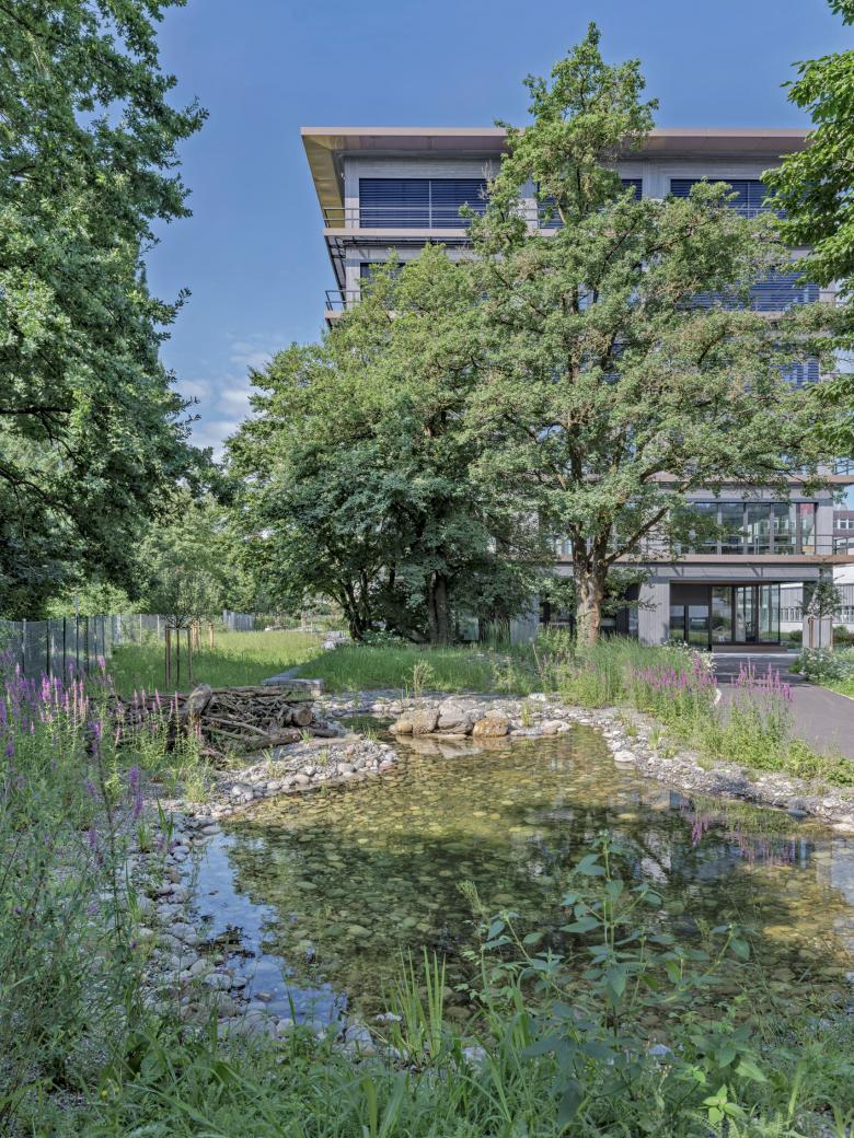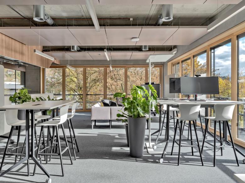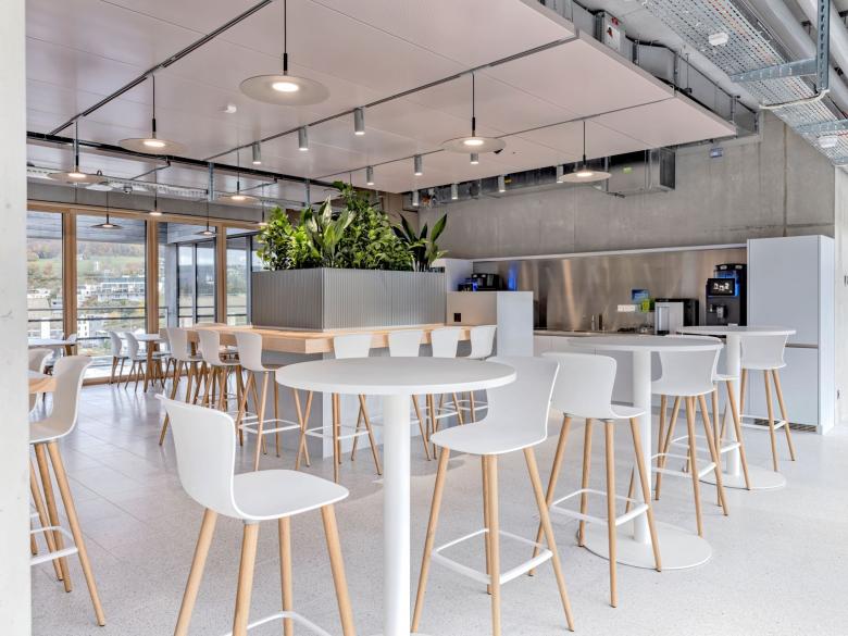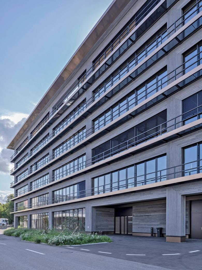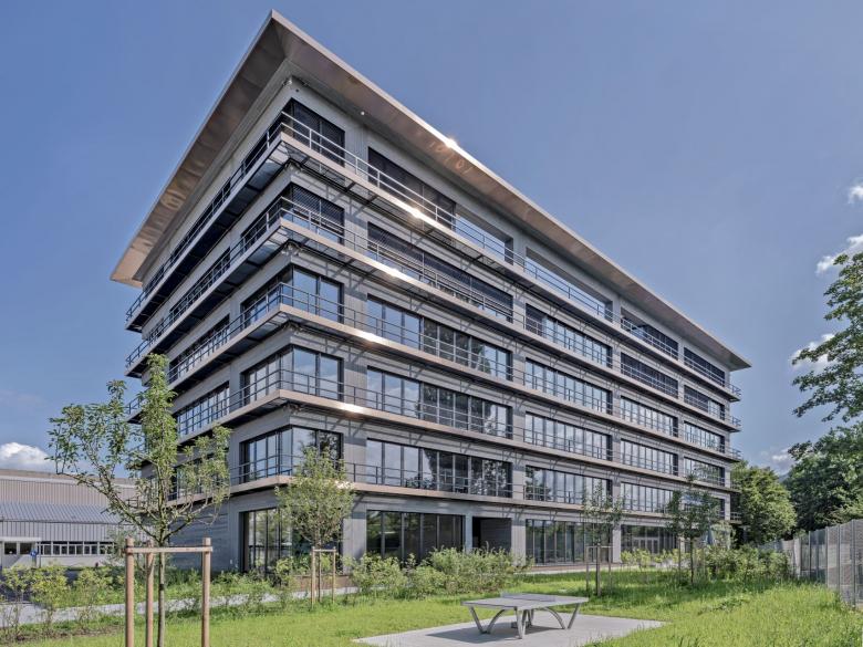 Der im Inneren stützenfreie Bau ist als Skelettstruktur konzipiert und mit einem durchgängigen Kern versehen. Zwei Treppenanlagen verbinden die offenen Geschosse mit den Kollektivflächen im Erdgeschoss, den drei Eingängen und den Mitarbeiterzonen im Dachgeschoss. Die Transparenz über die verschiedenen Räume und Geschosse trägt zu einer offenen Arbeitswelt bei. Das Gebäude ist als Minergie-ECO Bau ausgeführt, wobei auch weitere ökologische Massnahmen umgesetzt wurden. Die Planung- und Bauzeit betrug von der Definition des Raumprogramms bis hin zum Bezug, knapp 3 Jahre.