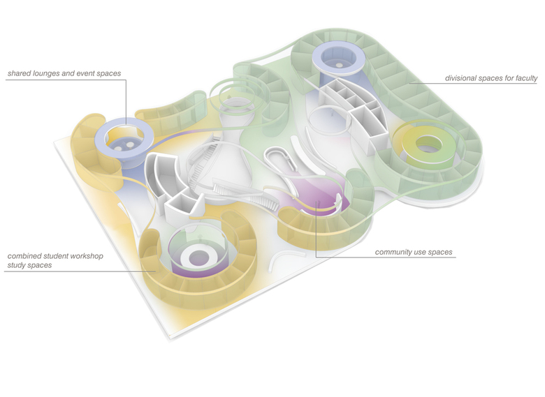 Student work-study spaces and faculty divisional spaces are concentrated in plan and section to promote collaboration across all disciplines. In addition, the spaces are connected vertically within a series of voids and internal staircases, and paralleled on several floors in one intensified zone.