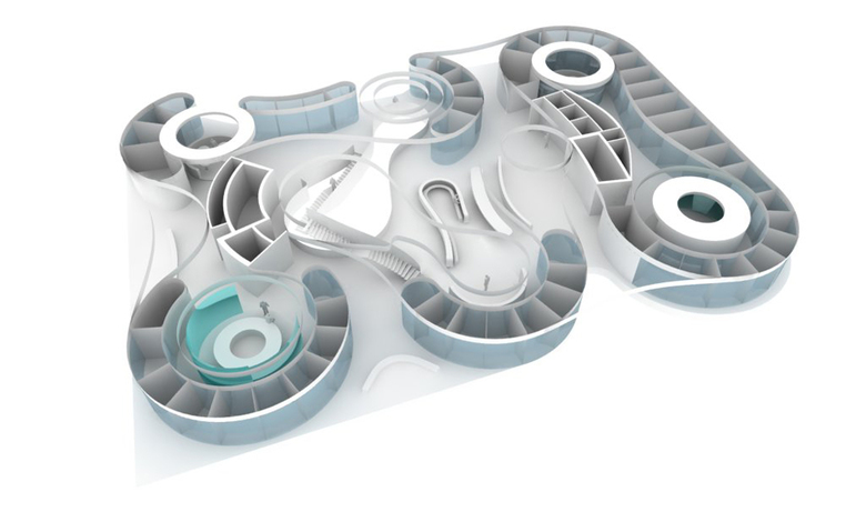 Both formal and informal interactions and encounters are encouraged throughout the design. Consideration for the interior organisation of spaces in relationship to one another begins with the circulation. Corridors are considered not in terms of size, but for their capacity to contain and distribute large concentrations of people, whilst simultaneously accommodating surges in traffic and lingering individuals. Infrastructural space is employed to orchestrate informal interaction and enable a heterogeneous mixture of these spaces that are open for reconfiguration and appropriation. The building, therefore, has no traditional corridors, but maintains qualitative networking conditions.