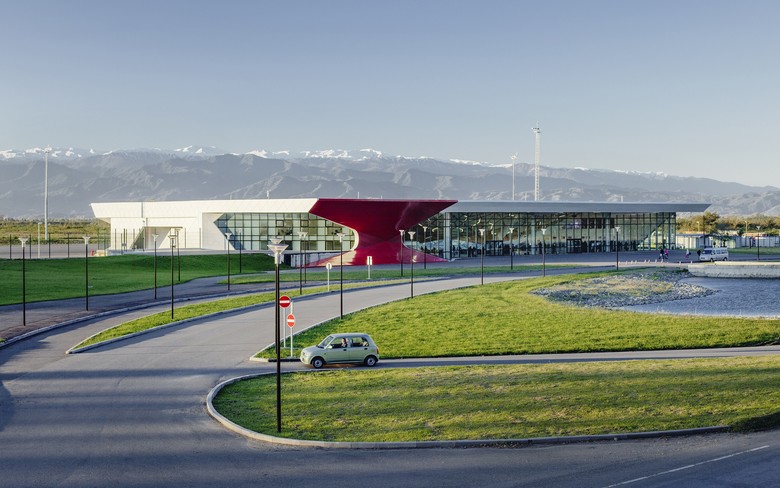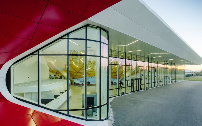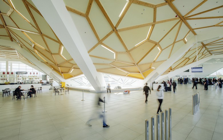 The new Kutaisi 'King David the Builder' International Airport - which serves domestic and international flights for use by tourists, national politicians and international diplomats - incorporates both Georgia’s historic landscape and its architecture. The architecture of the terminal refers to a pavilion; a gateway, in which a clear structural layout creates an all-encompassing and protective volume. The volume is structured around a central exterior space which is used for departing passengers. The transparent space around this central point is designed to ensure that flows of passengers are smooth and that departure and arrival flows do not coincide. Both the exterior corner detail and the so called 'umbrella' structure within the terminal building – which operates as a roundabout for passenger flows - operate as the two main architectural details around which all of the airport functions are organised.