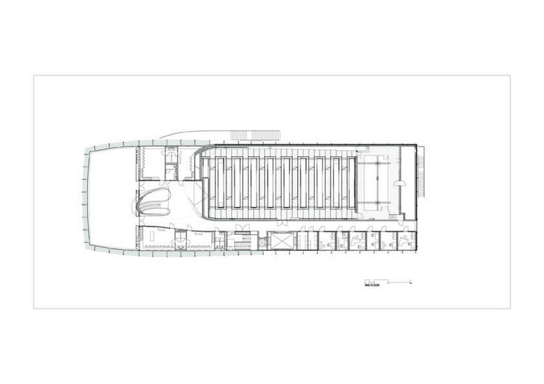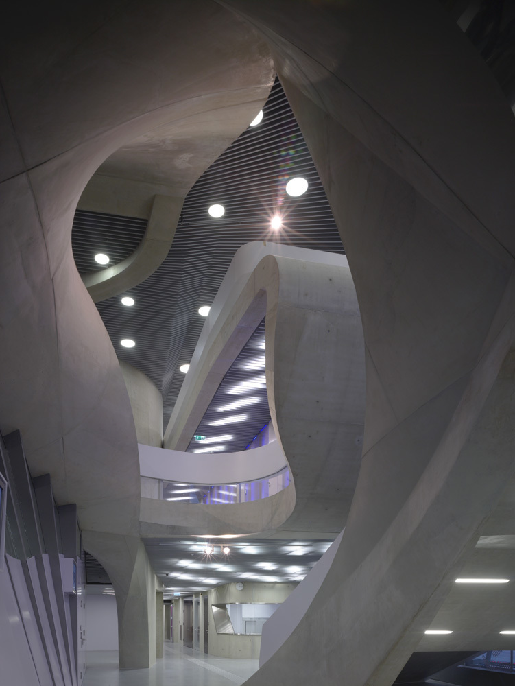 The building is structured to combine a unit-based volume (the black box of the theatre) and a series of movement-based volumes (foyer and public circulation). Because this organising principle is made constructive, a fluent internal spatial arrangement is actualised, efficiently connecting spaces to each other. The multipurpose auditorium can seat up to 450, and is adaptable to a great variety of performances. The free-flowing space of the foyer is made possible by a spiraling constructive element that connects the entrance to the auditorium and to the music rooms above, thus welding together ‘with a twist’ the three levels of this side of the building. This twist forms a 3D interpretation of the repetitive pattern, executed in the muted tones of stage make-up, which is applied to the facades and then enveloped by a glittering mesh.