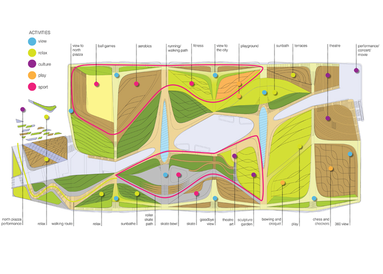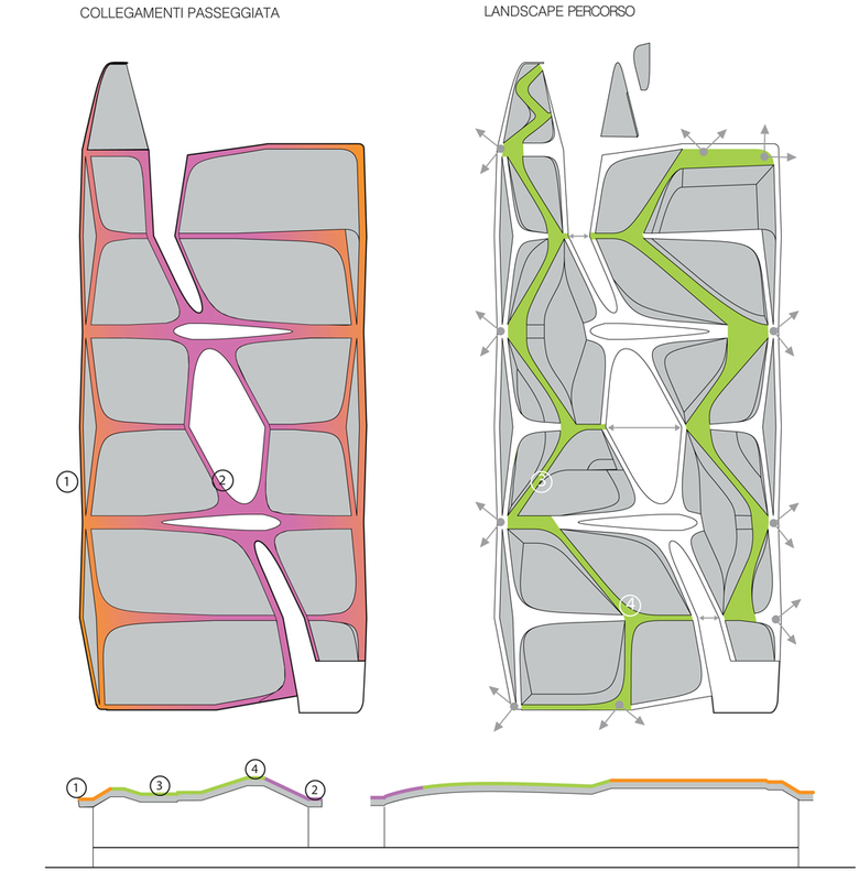Programming – The 20m high, 76.000m² Ponte Parodi building houses retail, cafés and restaurants, wellness, a cruise terminal, cultural programmes and a rooftop public park (18,900 m2) with an amphitheatre and botanical features. The programming of the building is designed to add to the existing attractions of its surroundings. This entails that the programming of the Ponte Parodi building takes advantage of the presence of a public already drawn by the existing harbour front attractions, whilst simultaneously complimenting and extending the amount of public visiting the area in such a way as to also benefit the existing programmes.