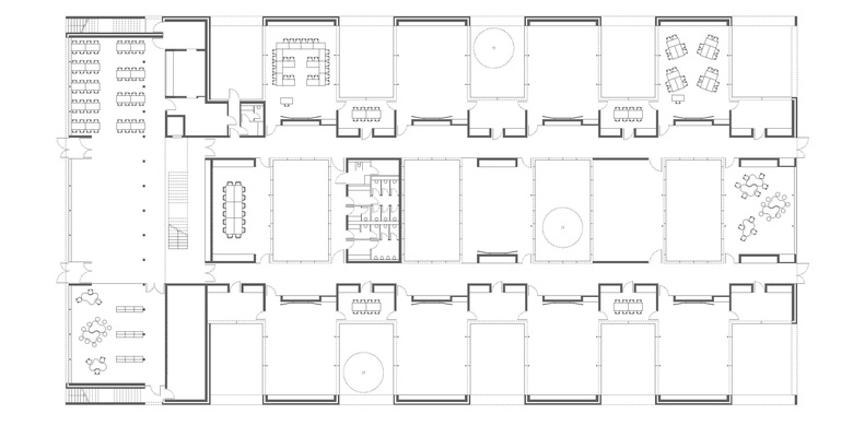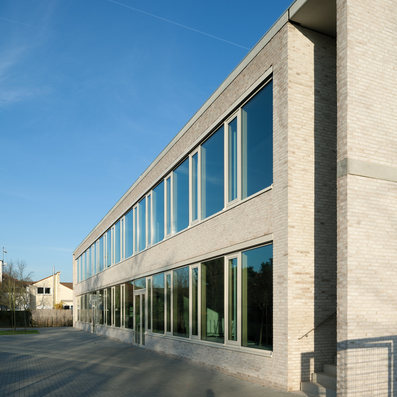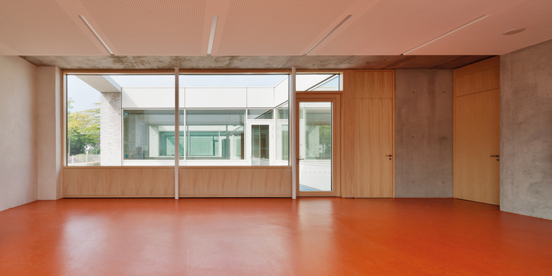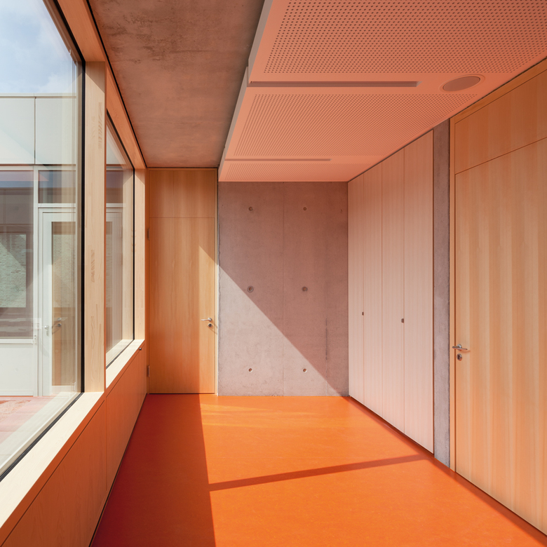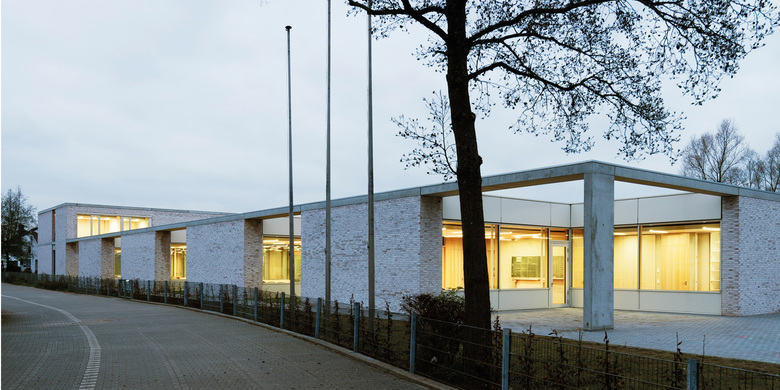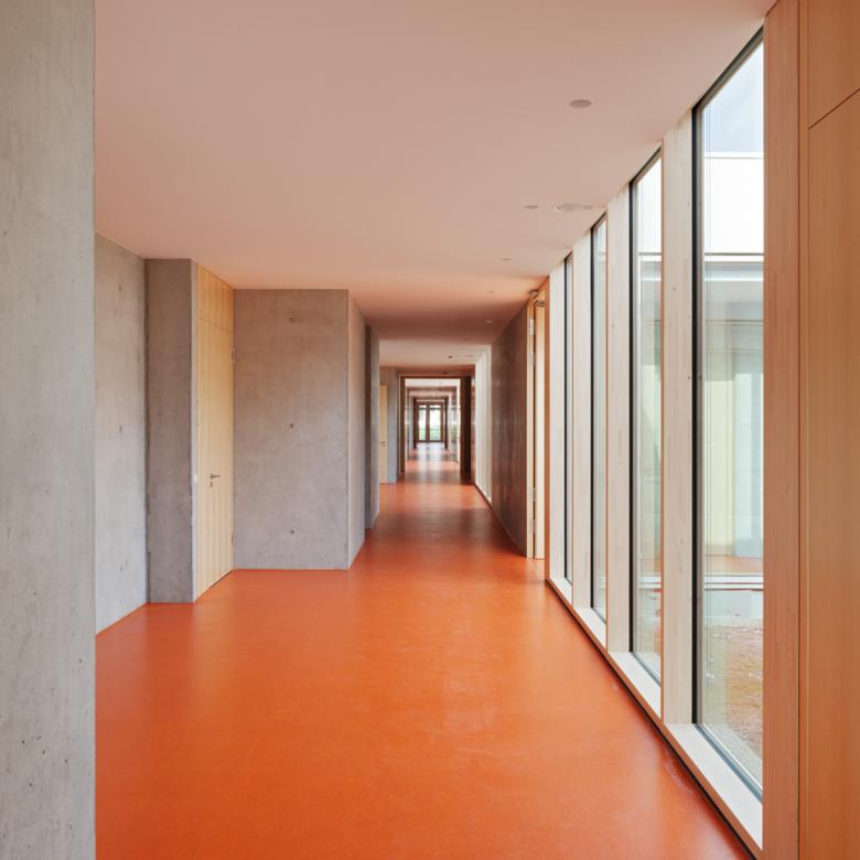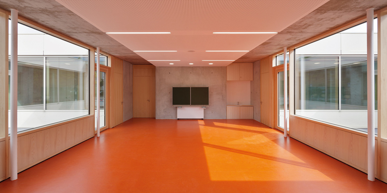Der zweigeschossige Kopfbau im Westen, in welchem die gemeinschaftlichen Nutzungen angeordnet sind, markiert den Haupteingang. Über den erdgeschossigen, teppichartig organisierten Klassenbereich, welcher kindgerecht kleinmaßstäblich an den Kopfbau anschließt, gelangen die Schüler zum geschützten, im rückwärtigen Bereich gelegenen Schulhof. Jedem Klassenraum ist ein Klassengarten zugeordnet, der von der jeweiligen Klasse gepflegt und bepflanzt werden kann.