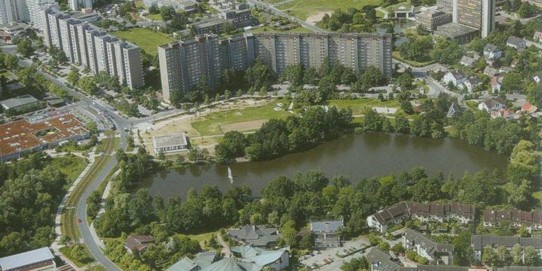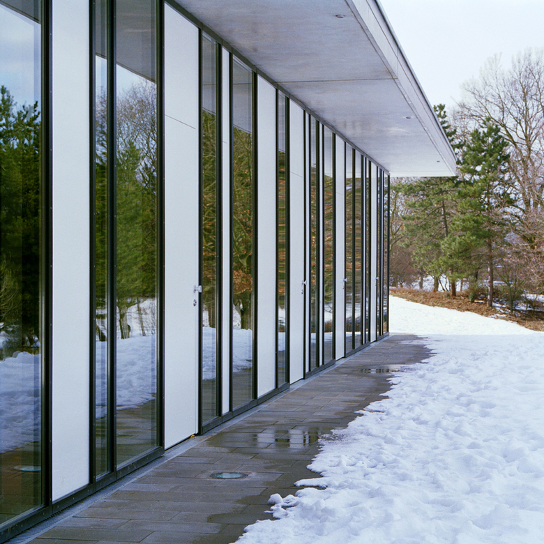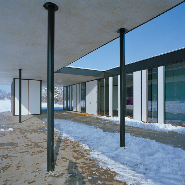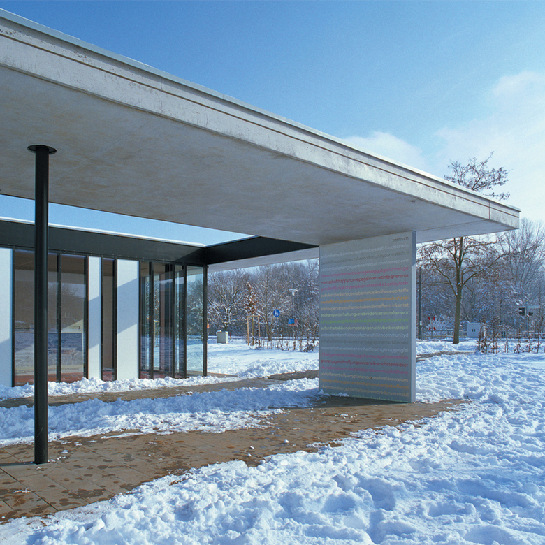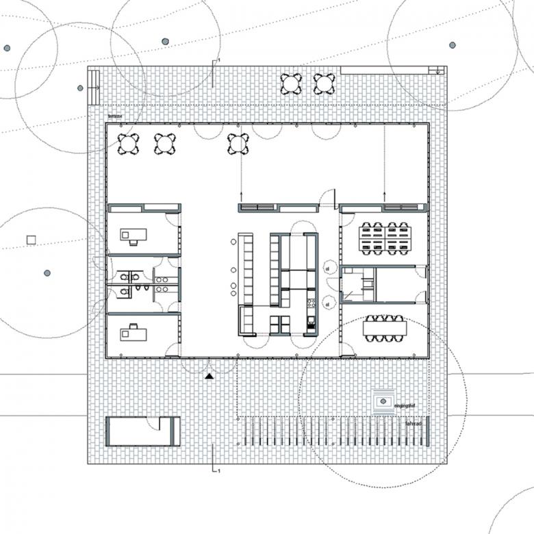 Der Neubau für das Jugendcafe ist als pavillonartiger Baukörper am Eingang zur Brentanoanlage, zum See hin ausgerichtet, konzipiert. Am bestehenden Weg angelagert, greift das quadratische, auskragende Dach als Pergola aufgelöst über den Weg, markiert den Eingang und definiert einen Zwischenraum, der Bestandteil des Parks und zugleich des Jugendcafés wird. Vielfältige Blickbeziehungen sowie die zentrale, kommunikative innere Organisation entsprechen dem inhaltlichen pädagogischen Konzept und erlauben zugleich eine einfache, klare Orientierung.