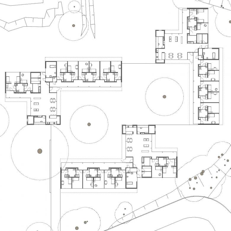 Die 3 kleinen Kinderhäuser auf dem Zentralgelände des St. Vincenzstift, welche im Rahmen der Konzeption „Mit ins Leben gehen“ gebaut wurden, bieten gut überschaubaren Wohnraum für Kinder mit Behinderung - weg von der Institution hin zu familienähnlichem Wohnen. Der barrierefreie Zugang der erdgeschossigen Häuser erfolgt über 2 ineinander übergehende Höfe. Die transparenten Fassaden verknüpfen den Wohnraum mit dem umgebenden parkartigen Gelände und ermöglichen Blickbezüge zu den anderen Häusern.