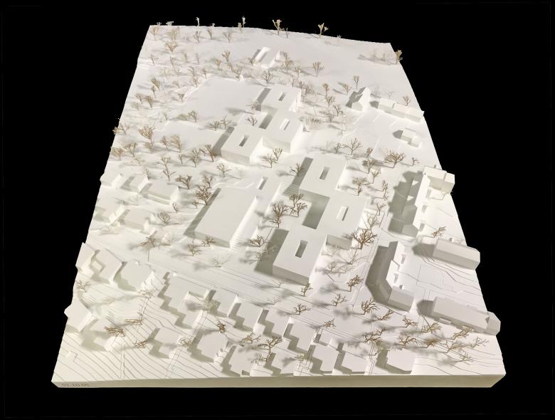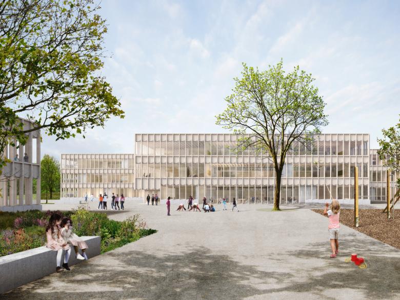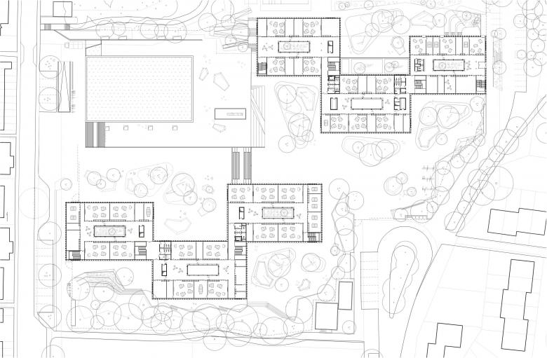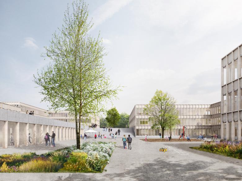 Jeweils drei gestaffelt zueinander versetzt angeordnete, zwei- bis dreigeschossige Lernhäuser bilden die Grundschule und das Förderzentrum. Ergänzt durch die Sporthalle entsteht ein kleinteiliges, identitätsstiftendes Ensemble, eine kleine Stadt, das sich mit kurzen Raumkanten sehr gut in die Maßstäblichkeit der Umgebung einfügt und in seiner Kleinteiligkeit auch für Kinder wahrnehmbar ist. Das stark abfallende Gelände wird in 3 Ebenen terrassiert und damit die Freiräume wie selbstverständlich den unterschiedlichen Nutzungen zugeordnet. Die Grundschule wird auch zukünftig im Norden über Hunsrückstraße, die Jakob-Muth-Schule über Harzstraße erschlossen. Auch die Garage und die Anlieferung der Küche erfolgt über die Harzstraße.