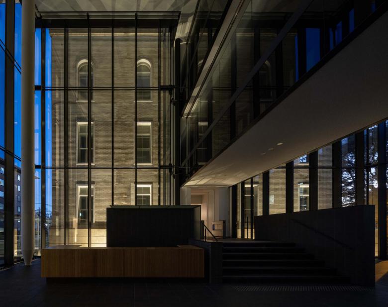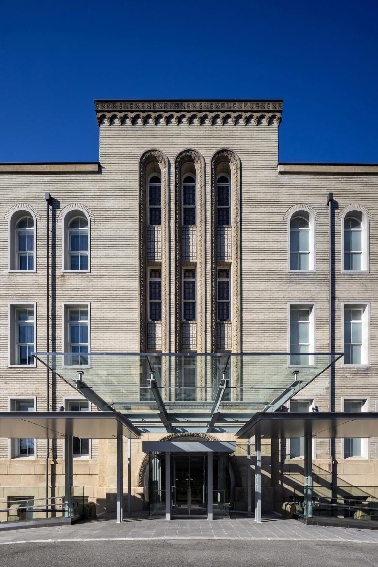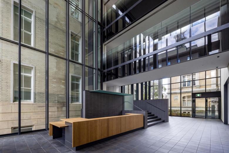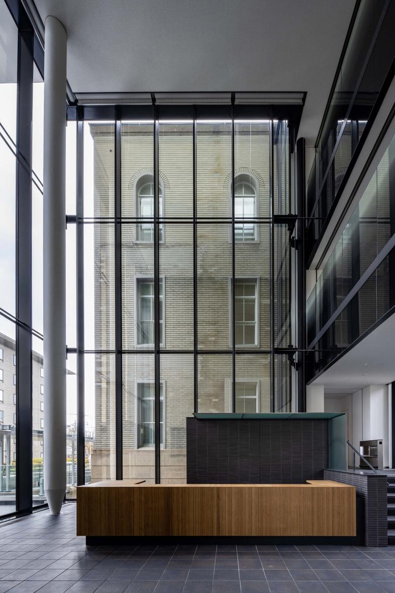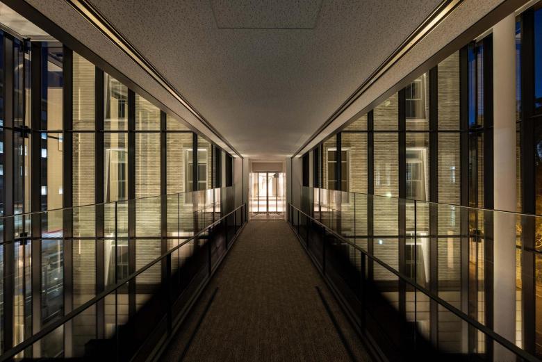 そうした意匠の考え方はエントランスホールであるガレリアに最も明瞭に表現したつもりだ。ガレリア正面には1905年竣工の京都府庁舎旧本館、左には1928年竣工の旧京都府警本部のそれぞれの立面が展開し、最後の右側には2023年竣工の新棟が面している。その中空には新棟と保存棟を結ぶブリッジは浮かんでおり、二つの建築が離れながらも関係を持つという象徴的な表現でもある。