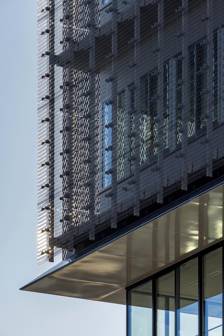 この建築は京都御所の西側、厳しい景観規制を受ける場所に建つ。保存棟と新棟を合わせると、新町通に面するファサードは120mの長さになり、これはほとんど京都の一街区の大きさに等しい。したがってこの南北に長い建築のファサードは単体としての建築というよりは一街区の連続立面として考えるというところから始まった。保存棟に比べると大きなヴォリュームとなる新棟との高さの連続性を穏やかに表現しながら2棟の時代の違いを同時に表現すること。保存棟がセセッションの建築ではあるが垂直方向には3層構成の古典性を保持しているため、そのことを鍵に新棟の意匠を決定した。