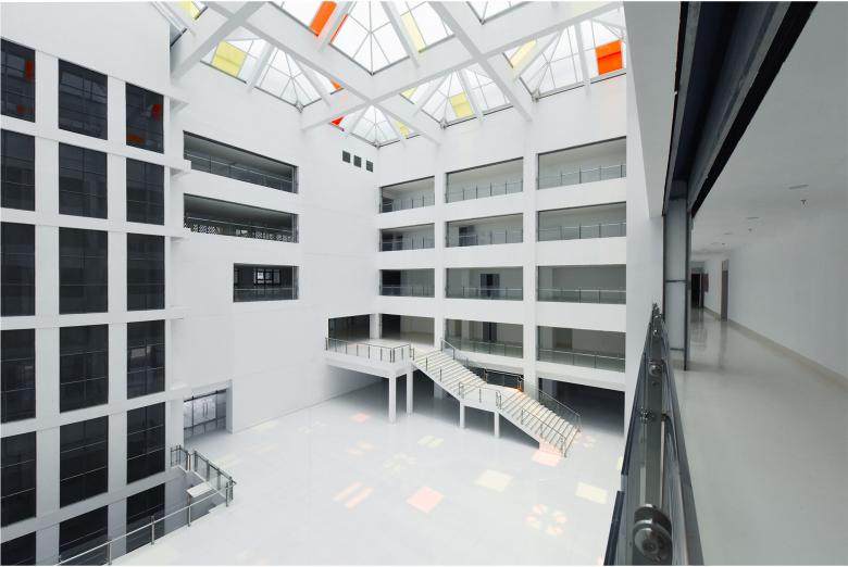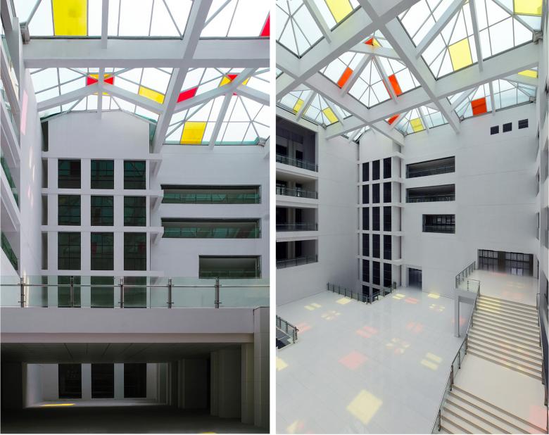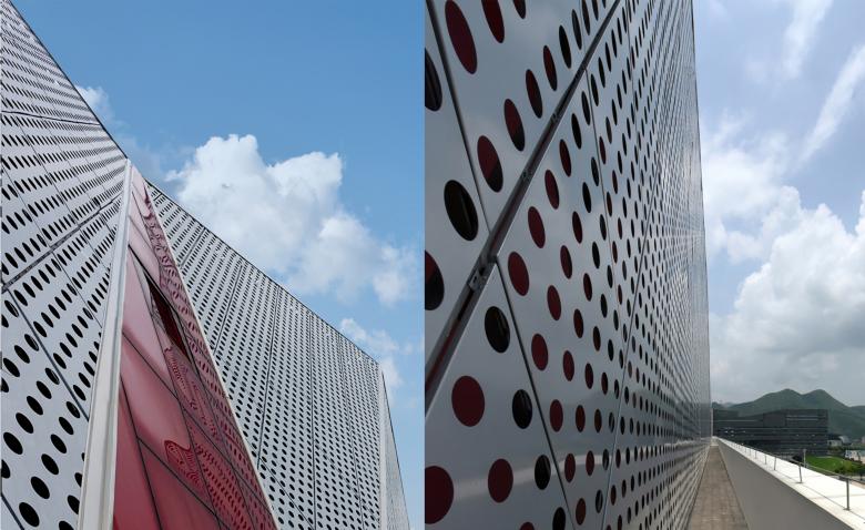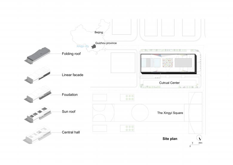 折叠屋顶源于贵州西南地区独特的峰丛地貌。屋顶被改造成彩色玻璃水晶和穿孔板。灵活的折叠屋顶在阳光下闪闪发光,在雨中褪色,隐喻若隐若现的群山。