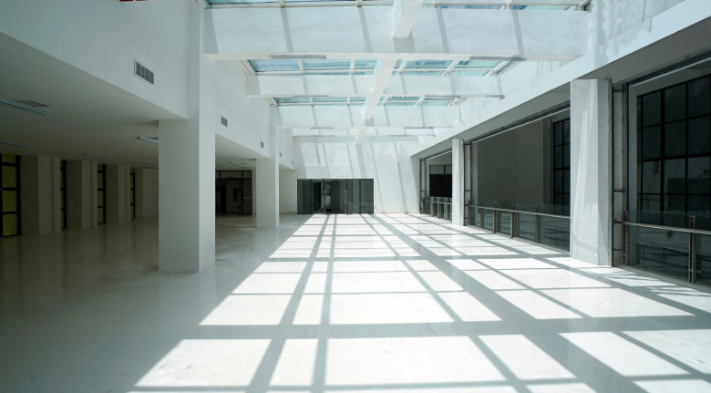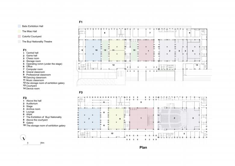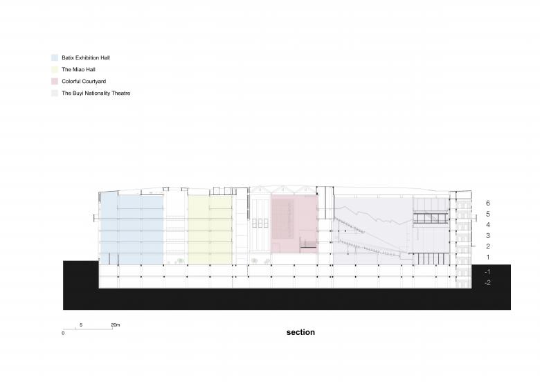 民族文化中心位于具有典型网格体系的城市区域。考虑到结构合理性、经济性,将大空间和小空间分别分组,建立由南向北延伸的三区空间控制模式,承载着三大主体功能:蜡染画馆、苗绣馆、和布依戏剧剧院。
