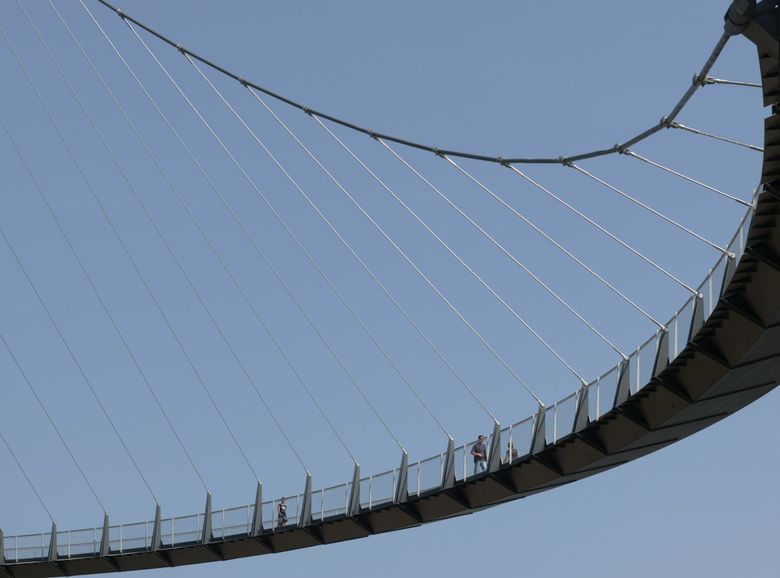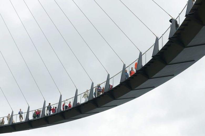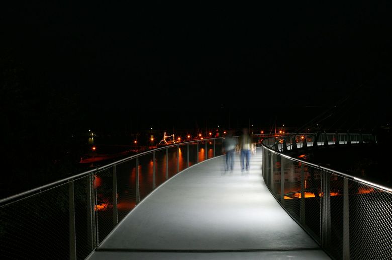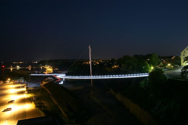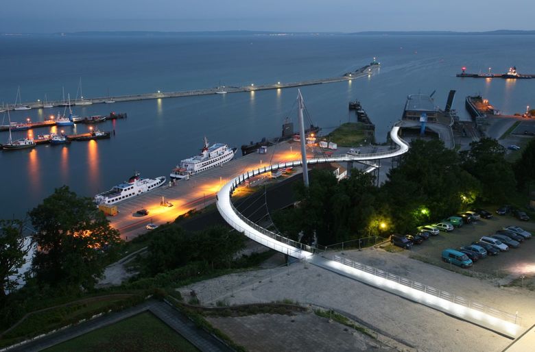 Die Fußgängerbrücke in Sassnitz verbindet die Oberstadt mit dem Hafen, sie wurde von Mai 2006 bis Juni 2007 gebaut. An einem hoch aufragenden Pylon ist die erste Kurve des Steges abgehängt. Der zweite Teil des Steges liegt auf Stützen auf.