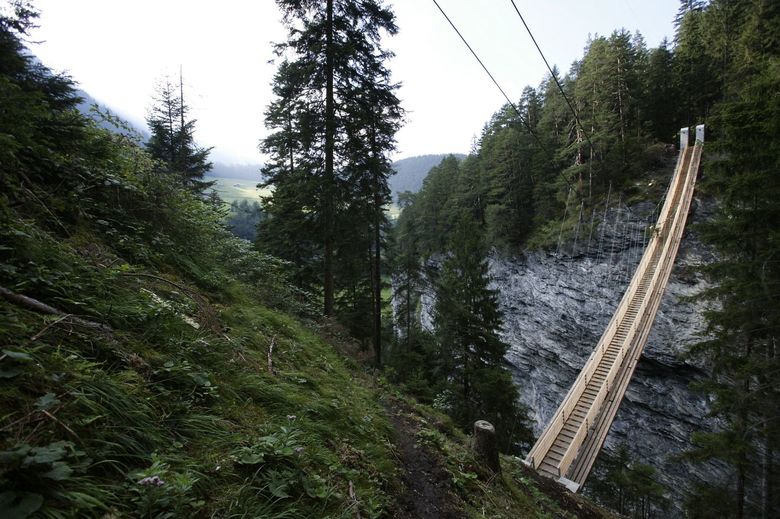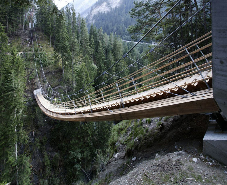 Der Traversinersteg II wurde 2005 gebaut, er quert den Traversinertobel als Hänge–konstruktion mit 95 m Spannweite.