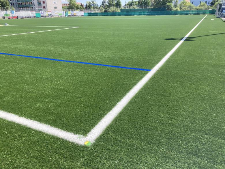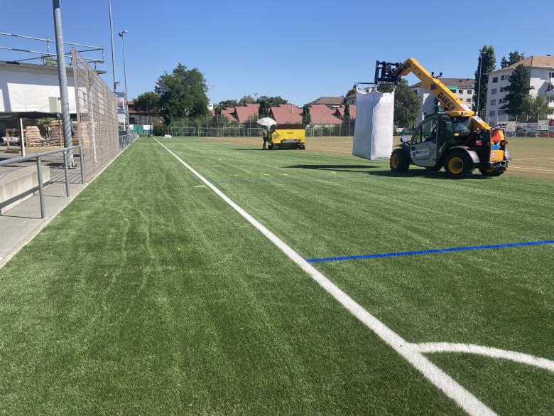 Ersatz des Kunstrasenbelags, Ergänzung des Entwässerungssystems und Einbau einer Asphalttragschicht. Anstatt der Kunststoffverfüllung wurde ein Kork-Granulat eingebaut.