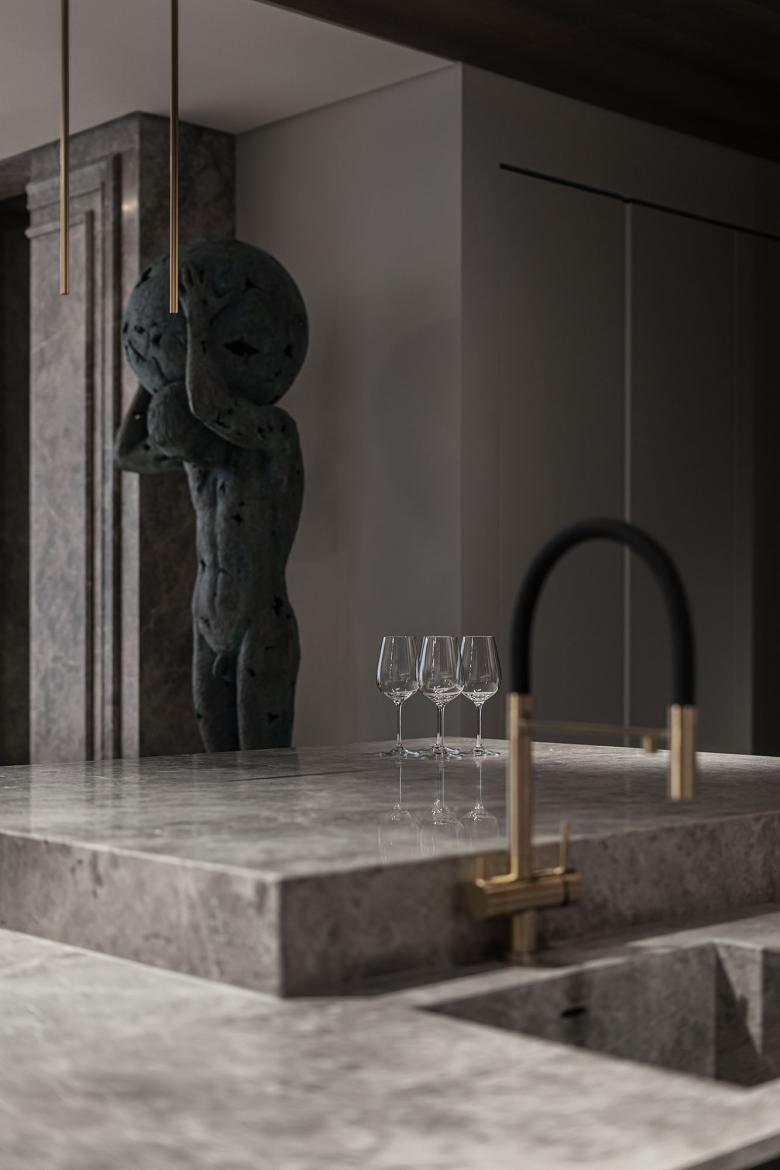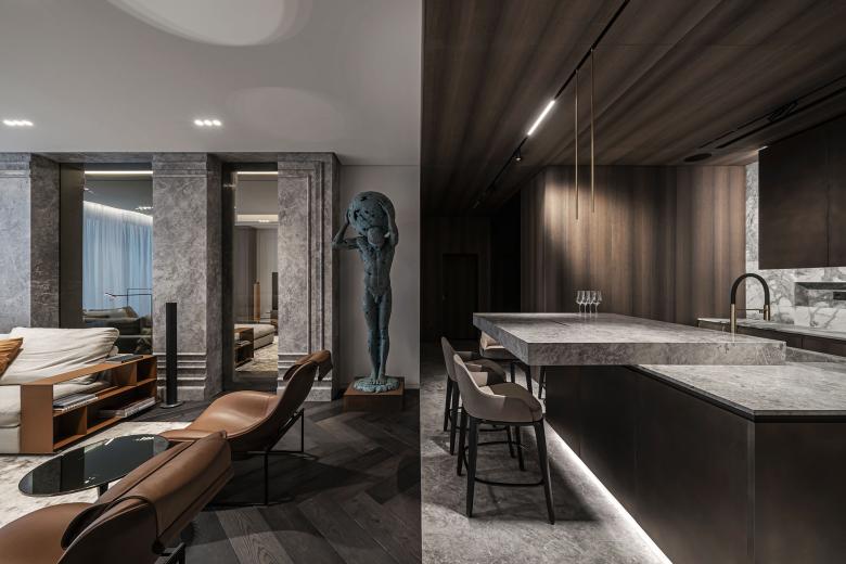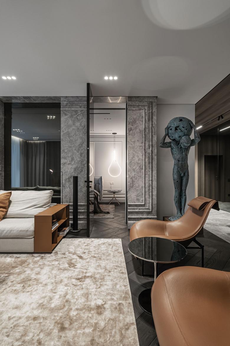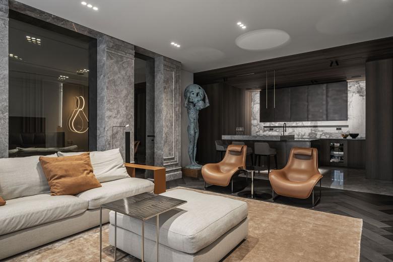 The design concept of this apartment was in implementing the idea of calm but subtle masculine manifestation inside these walls. We created a cozy and trusting vibe with a warm pastel palette, graphite glass partitions, a lot of custom items made of natural stone, and authentic art objects. Thus, every corner of this apartment does not attract attention with intensity but creates a confident atmosphere in which you want to stay.