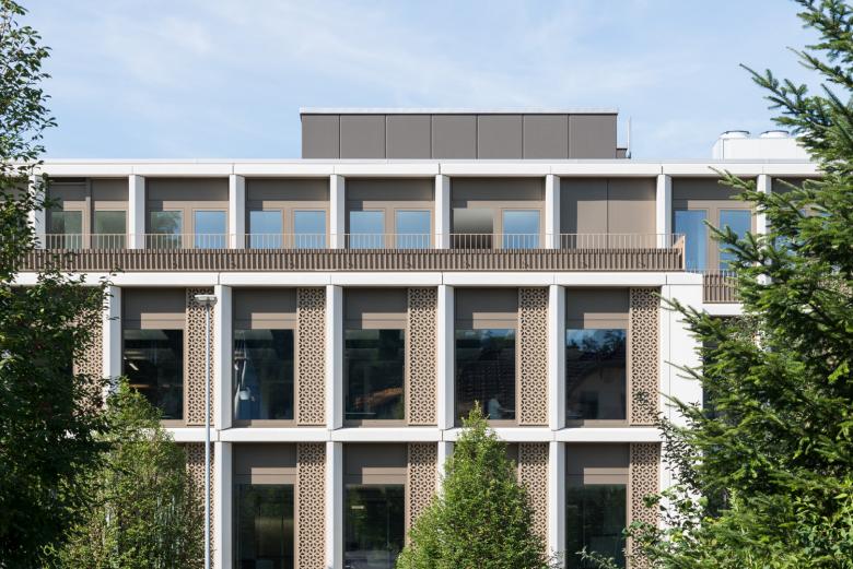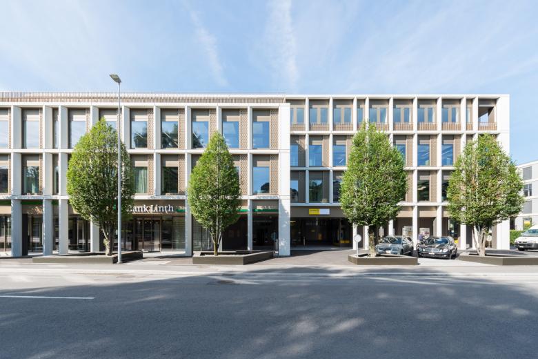 Die vorgehängte, feingliedrige Rippenstruktur besteht aus vorfabrizierten Betonelementen, die sich nach aussen verjüngen. Dadurch erhält die Fassade eine Leichtigkeit und eine verstärkte Tiefenwirkung. Zudem funktionieren die Rippen als Brise Soleil. Vor den Lüftungsflügeln sind perforierte Elemente montiert, deren Ornament auf die Rose aus dem Uzner Wappen verweist. Die neue Fassade verwandelte das Gebäude aus der 80er-Jahren in ein zeitgemässes und repräsentatives Wohn- und Geschäftshaus. Dies selbstverständlich in Einklang mit einer energetischen Optimierung: Der Wärmeverbrauch wurde halbiert, womit auch die Betriebskosten massiv sanken.